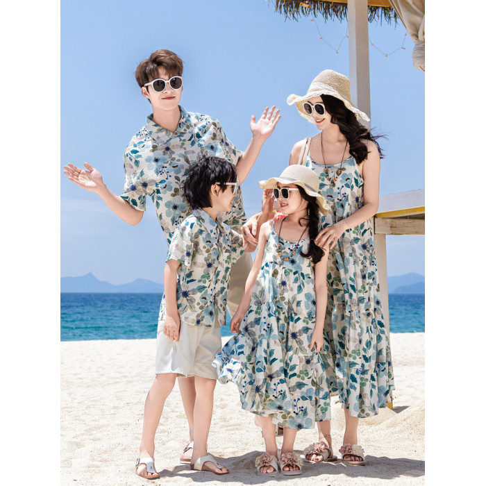 沙灘親子裝旅行穿搭海邊度假波西米亞民族風一家三口吊帶連衣裙