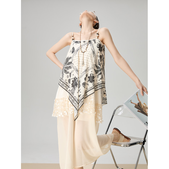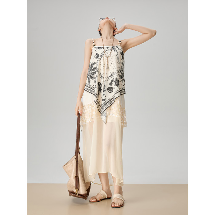 顧裡裡杏色印花拼接薄紗吊帶連衣裙子女高圓圓同款輕熟小衆不撞款