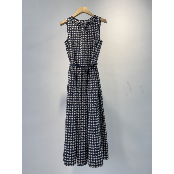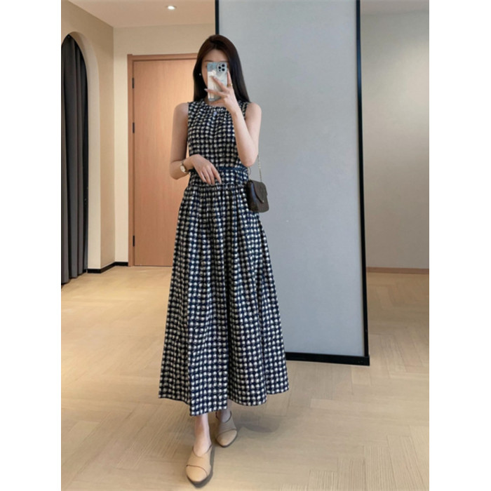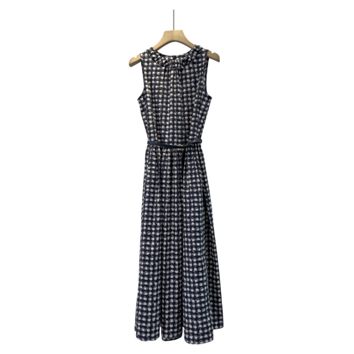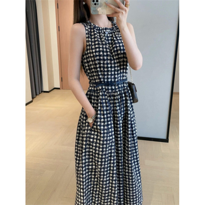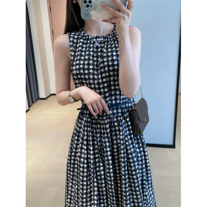 純元M家幾何印花純棉府綢無袖連衣裙高腰顯瘦中長款2025春夏新款