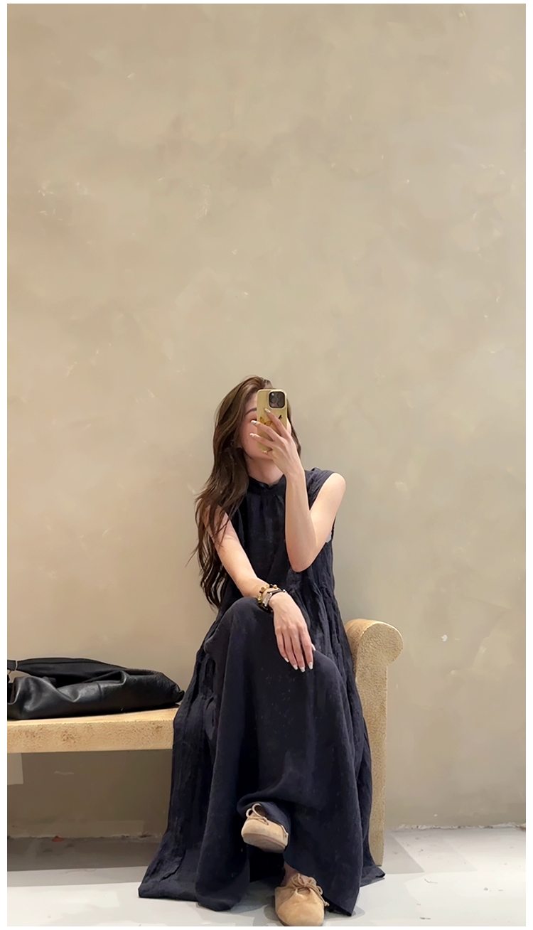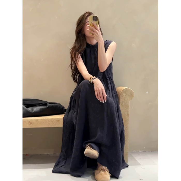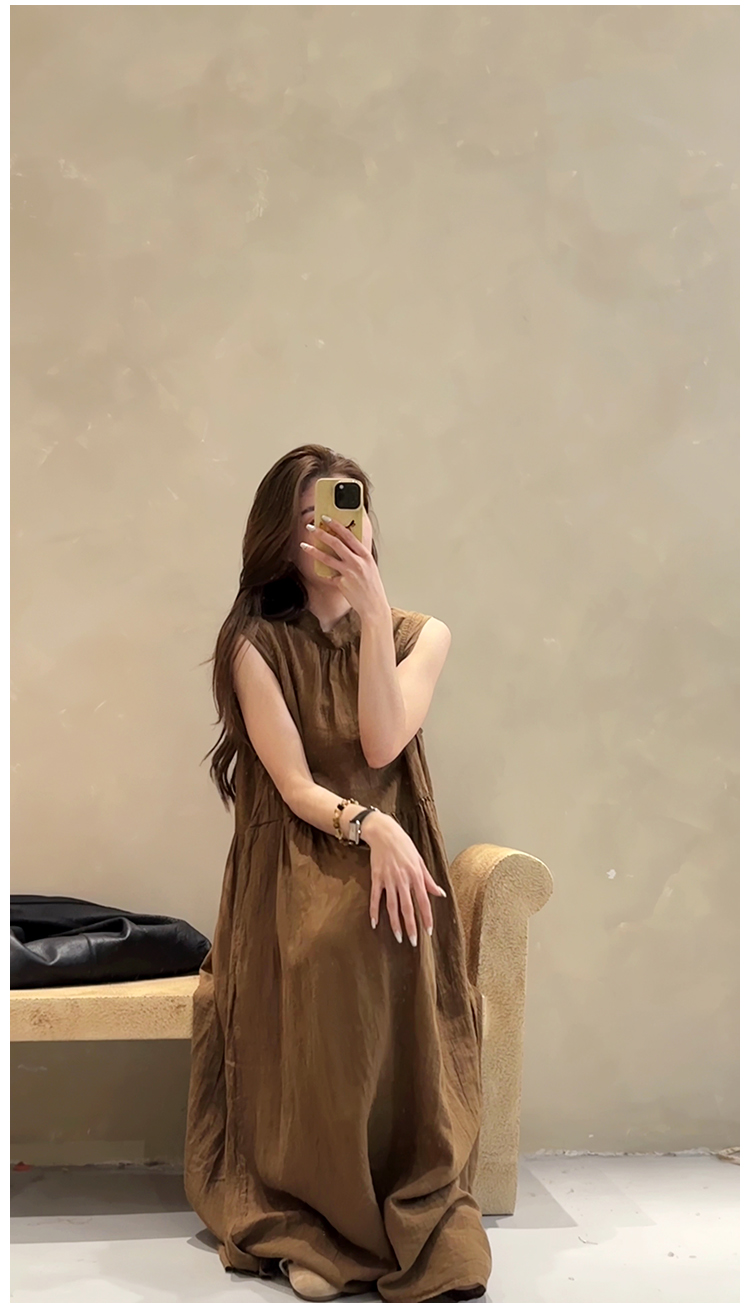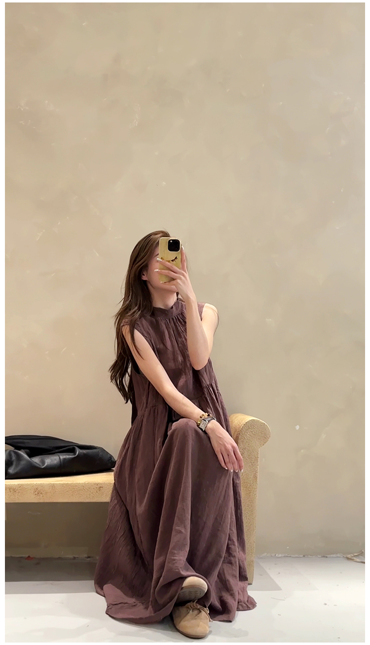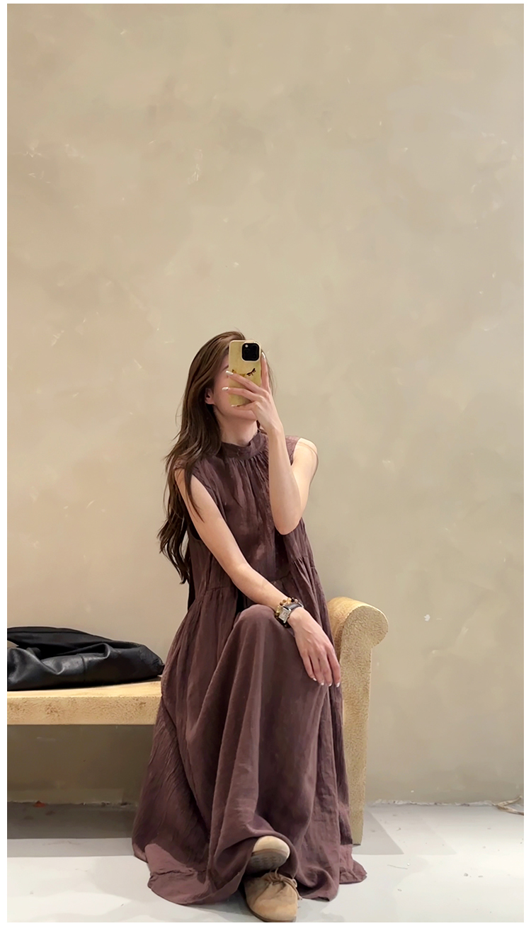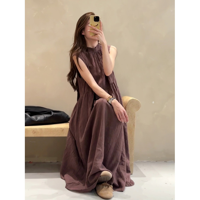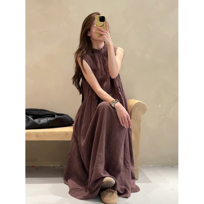 慄色褶皺直筒棉麻無袖連衣裙長款2025新款小衆不撞款顯瘦背心裙夏