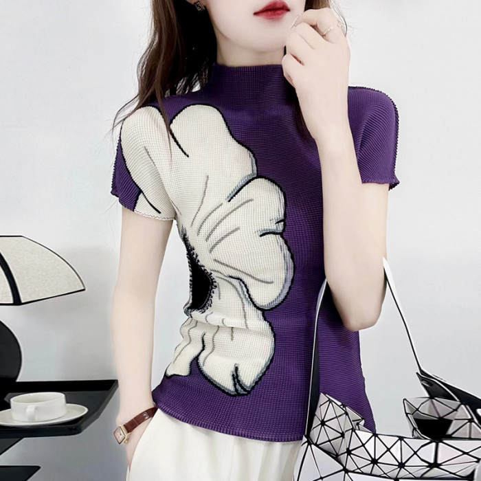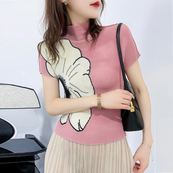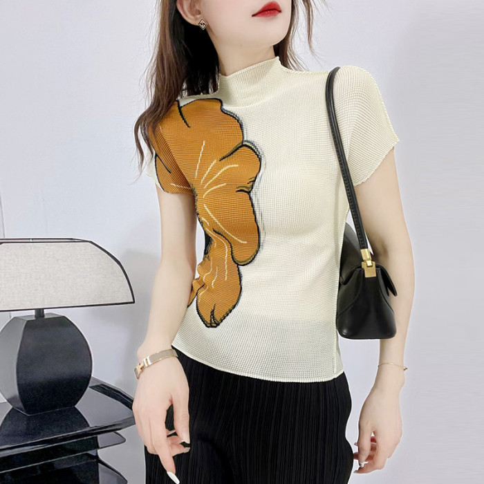 大花朵撞色刺綉針織衫女氣質通勤半高領褶皺短袖緊身顯瘦打底衫夏