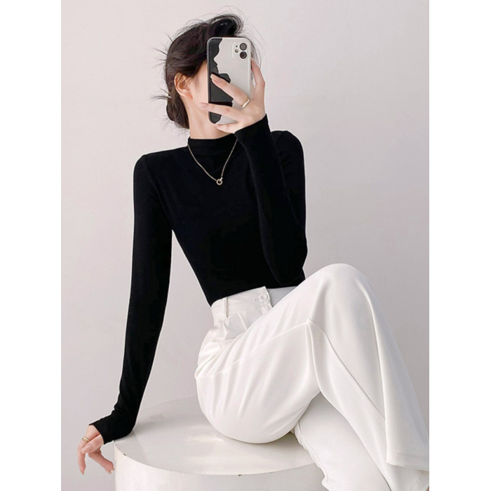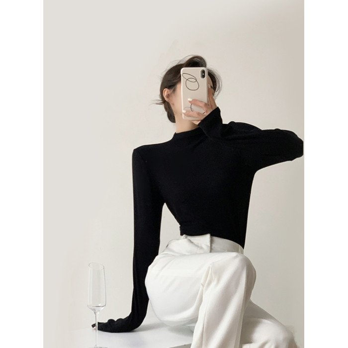 黑色半高領針織打底衫女2025秋冬長袖內搭中領小衆設計感顯瘦上衣
