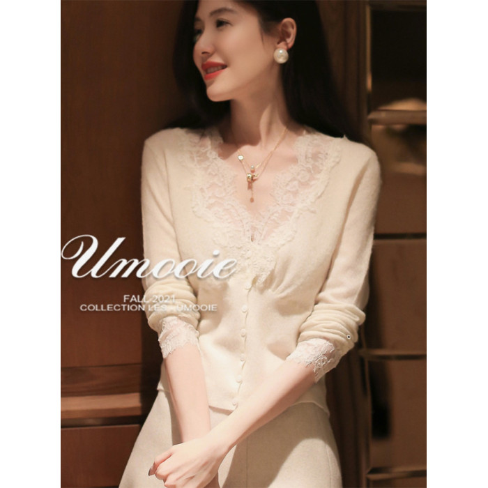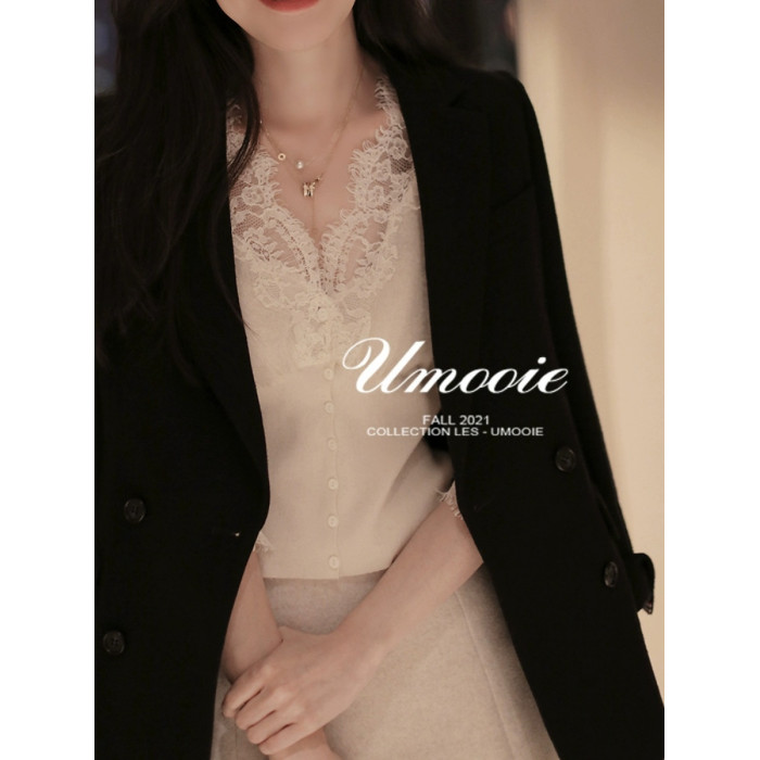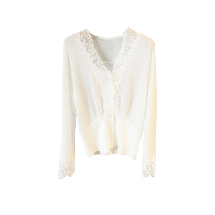 法式V領針織衫女夏季穿搭設計感蕾絲拼接顯瘦羊毛打底衫內搭上衣
