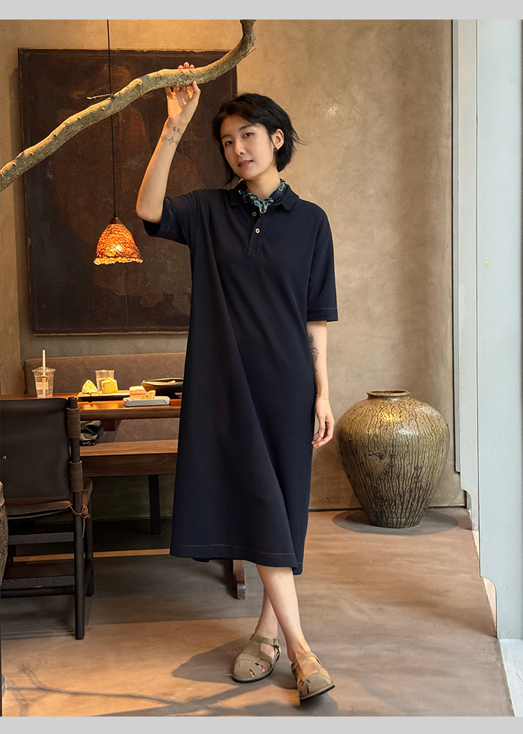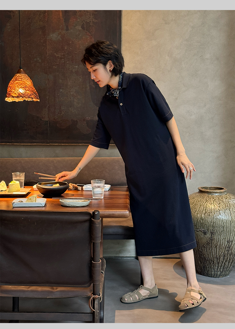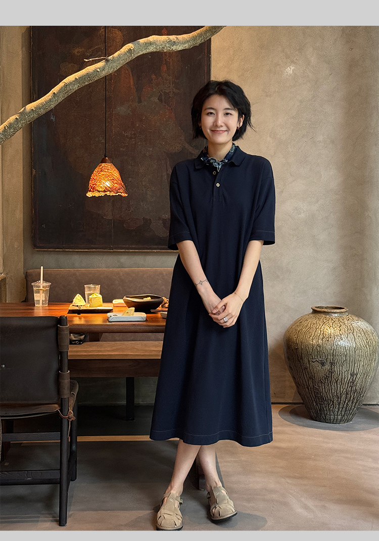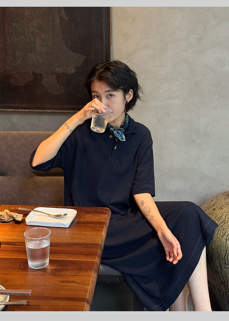 周浪清藏青色polo領a字短袖連衣裙夏女2025新款小個子中長款裙子