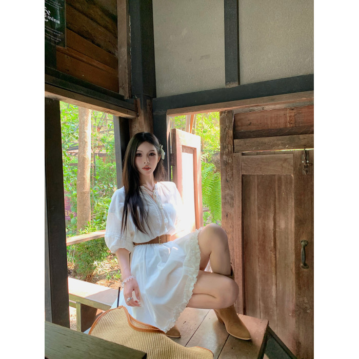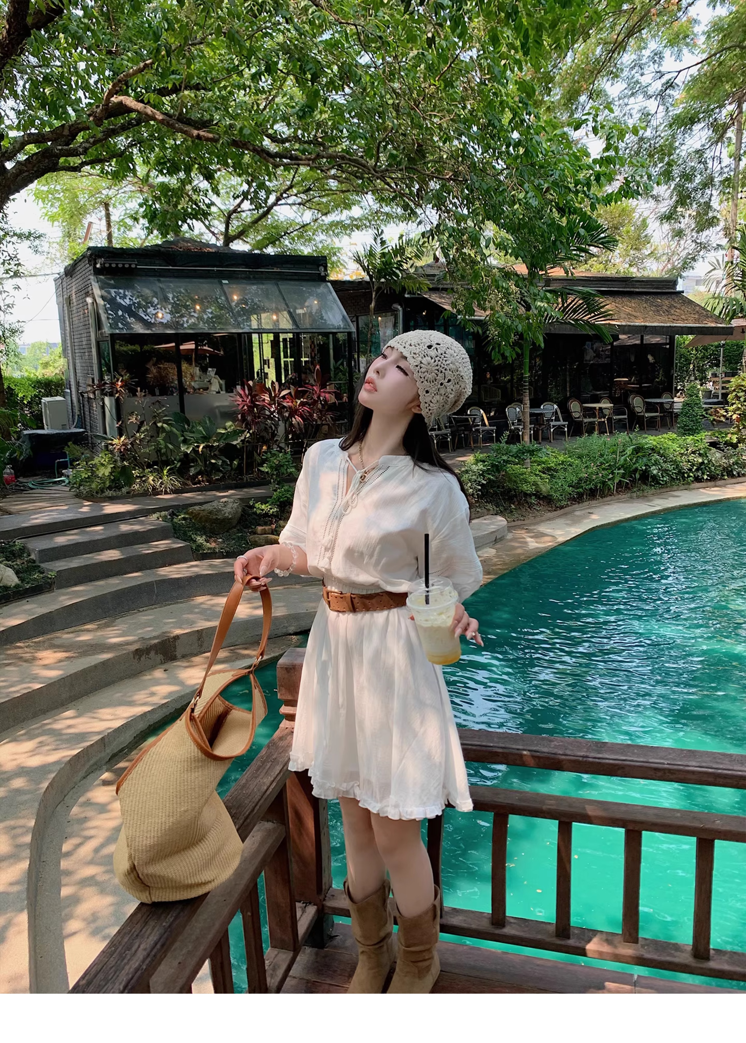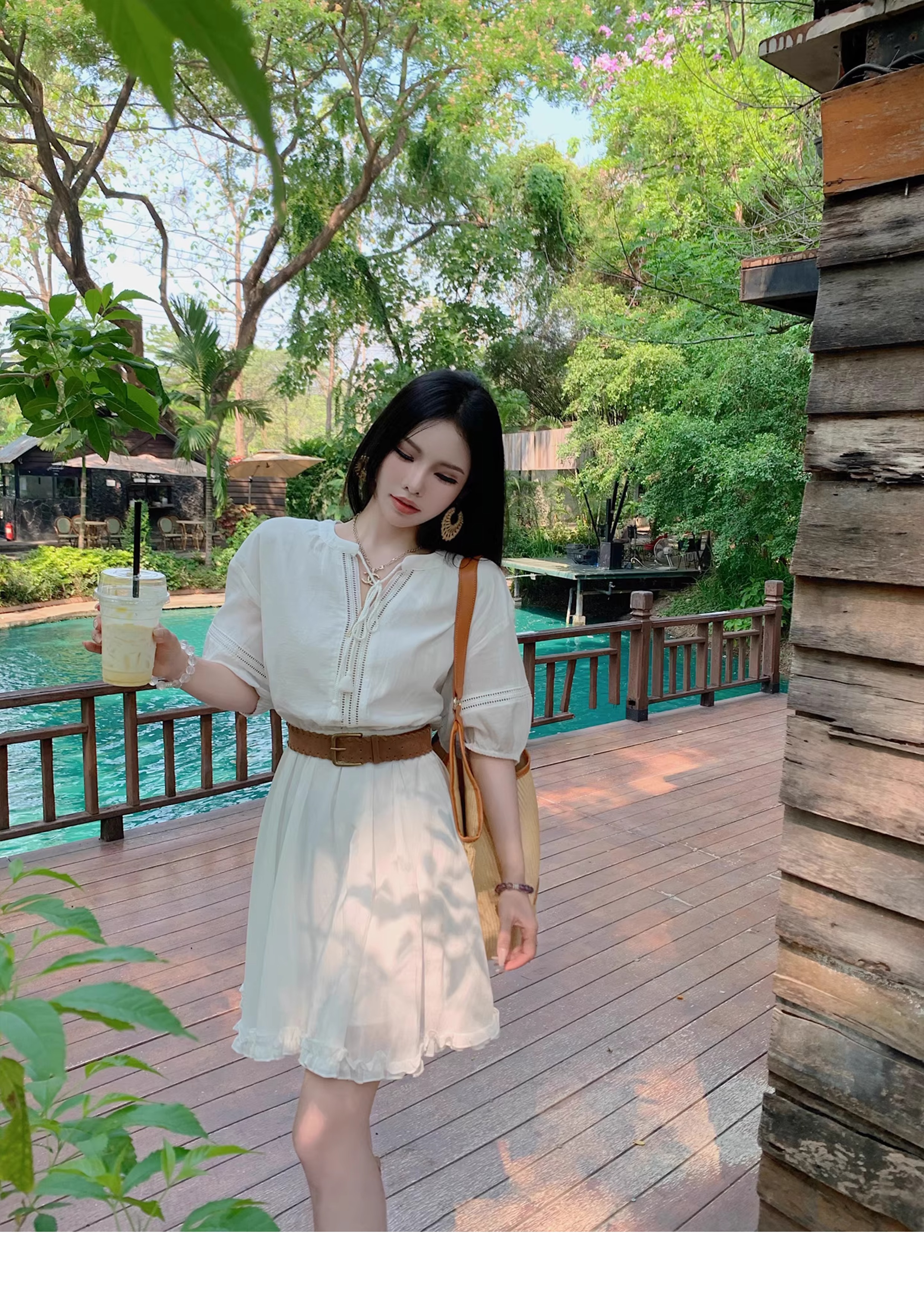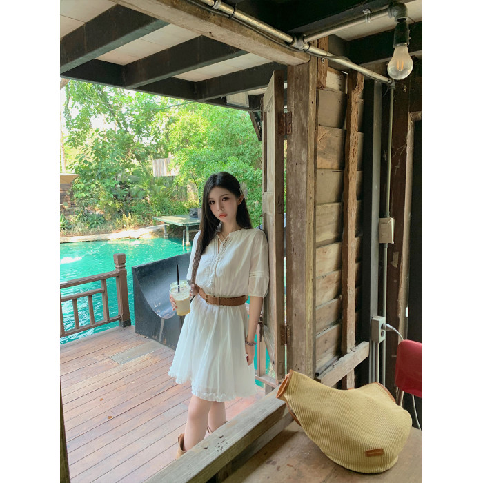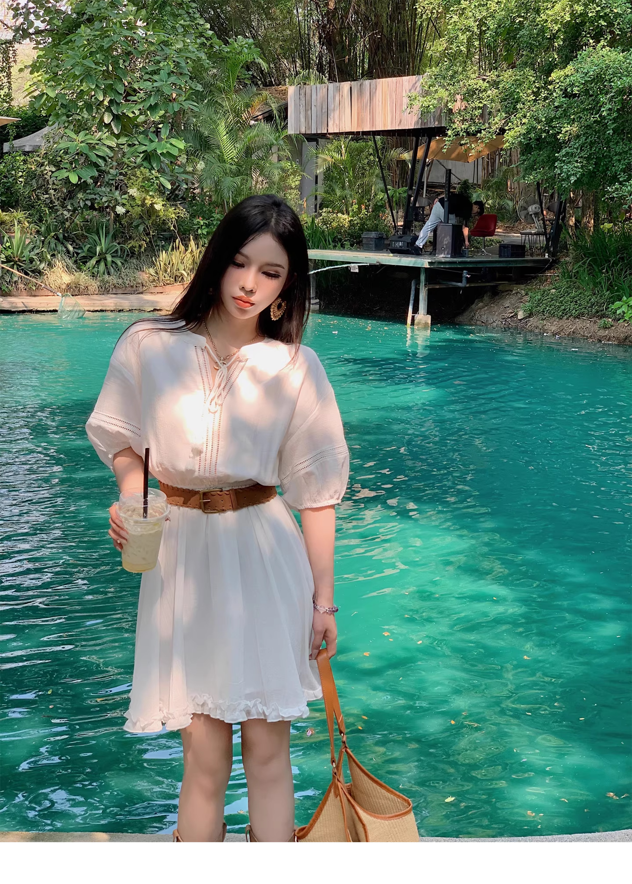 onelady 波西米亞v領系帶連衣裙女夏季新款白色收腰重工度假短裙