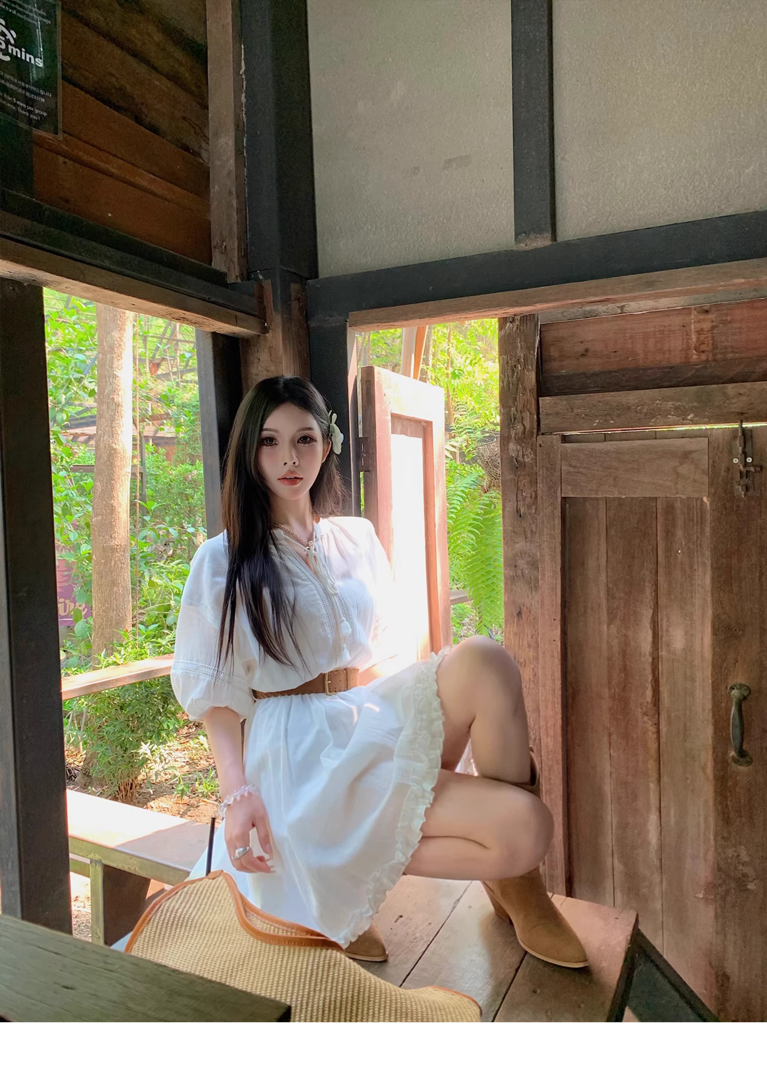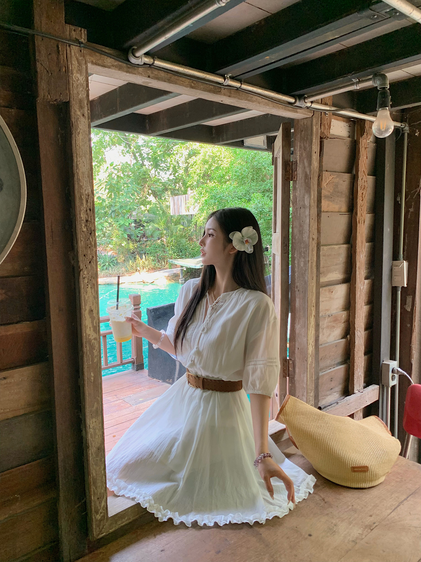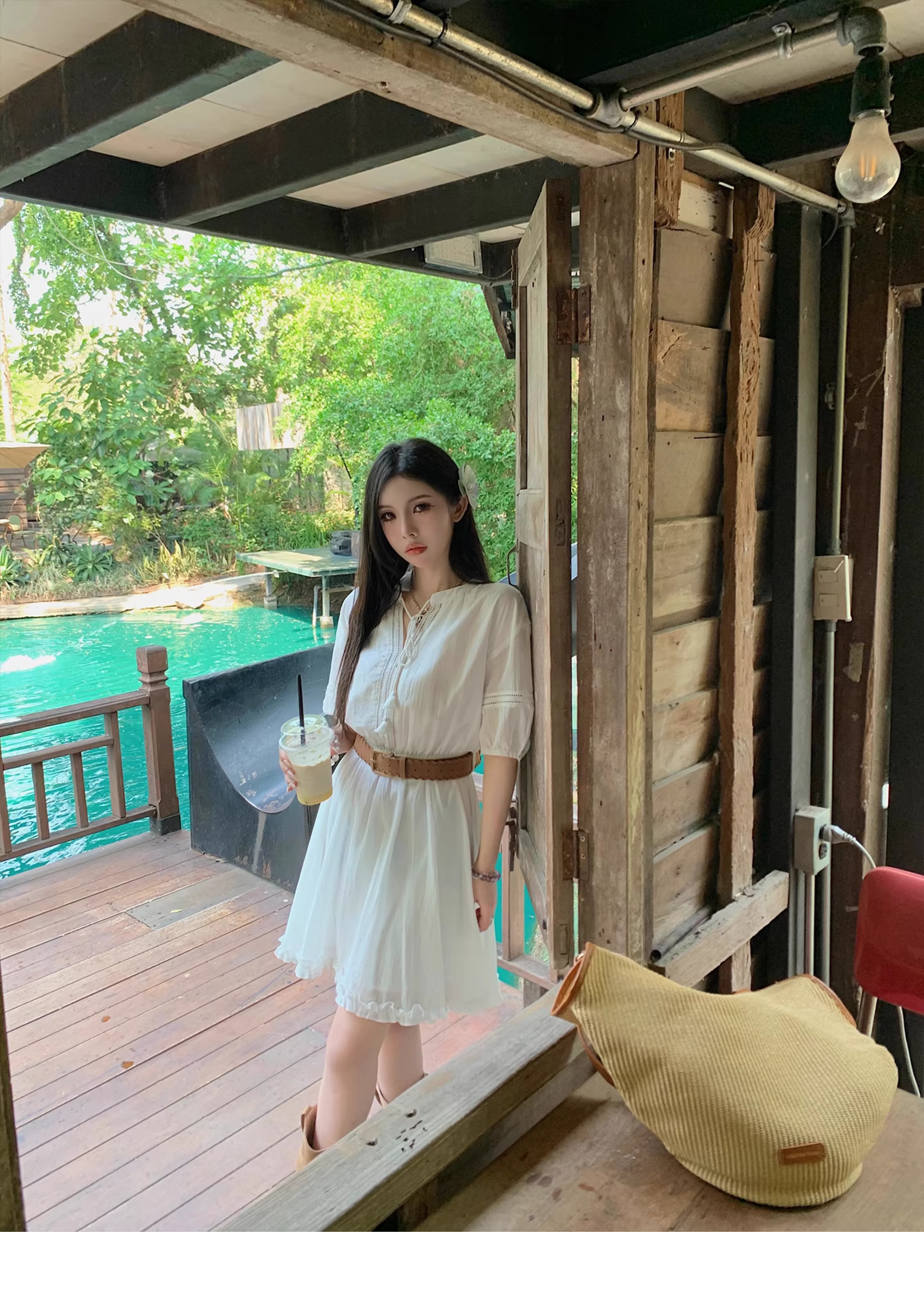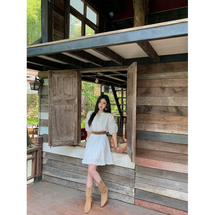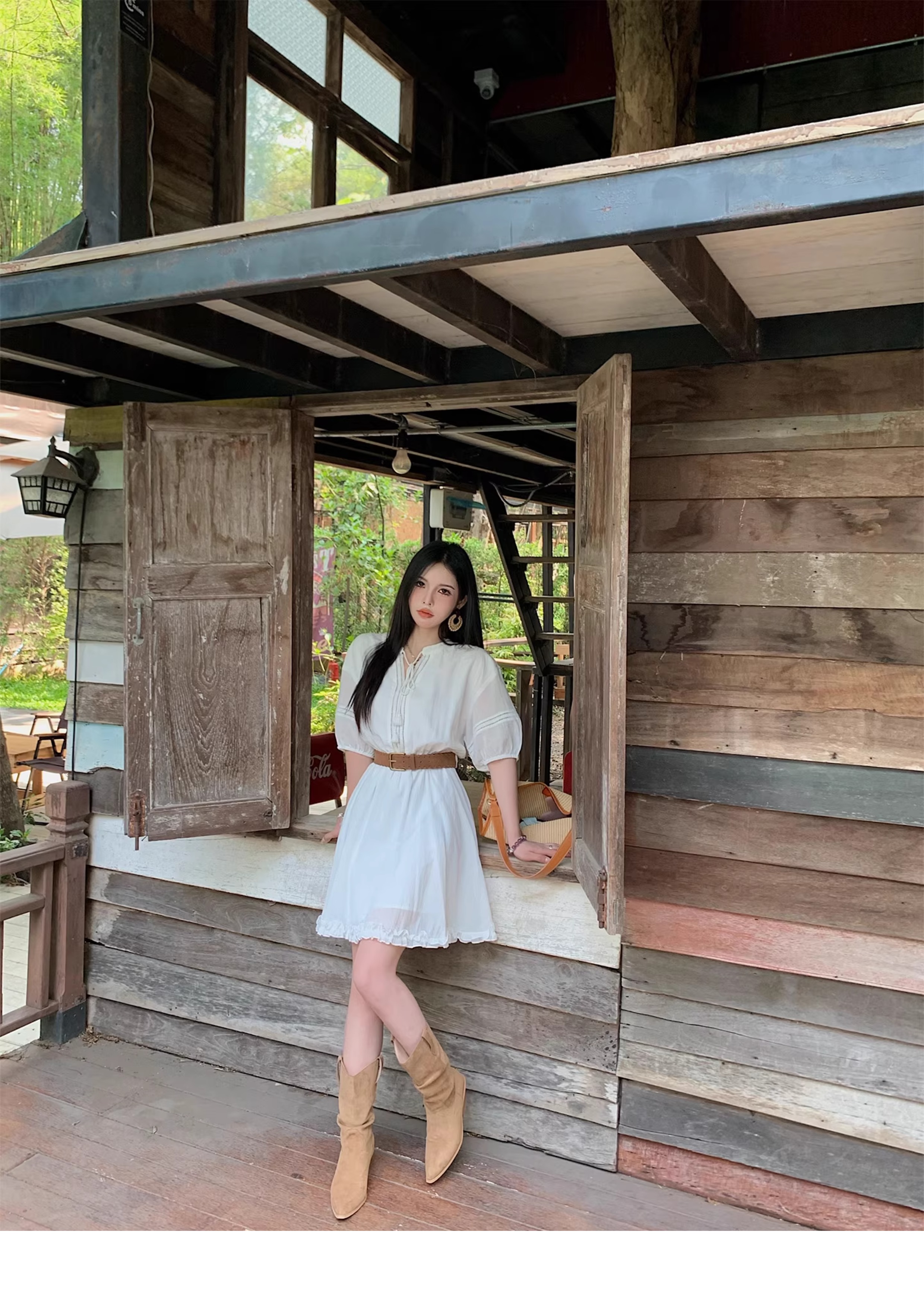 onelady 波西米亞v領系帶連衣裙女夏季新款白色收腰重工度假短裙