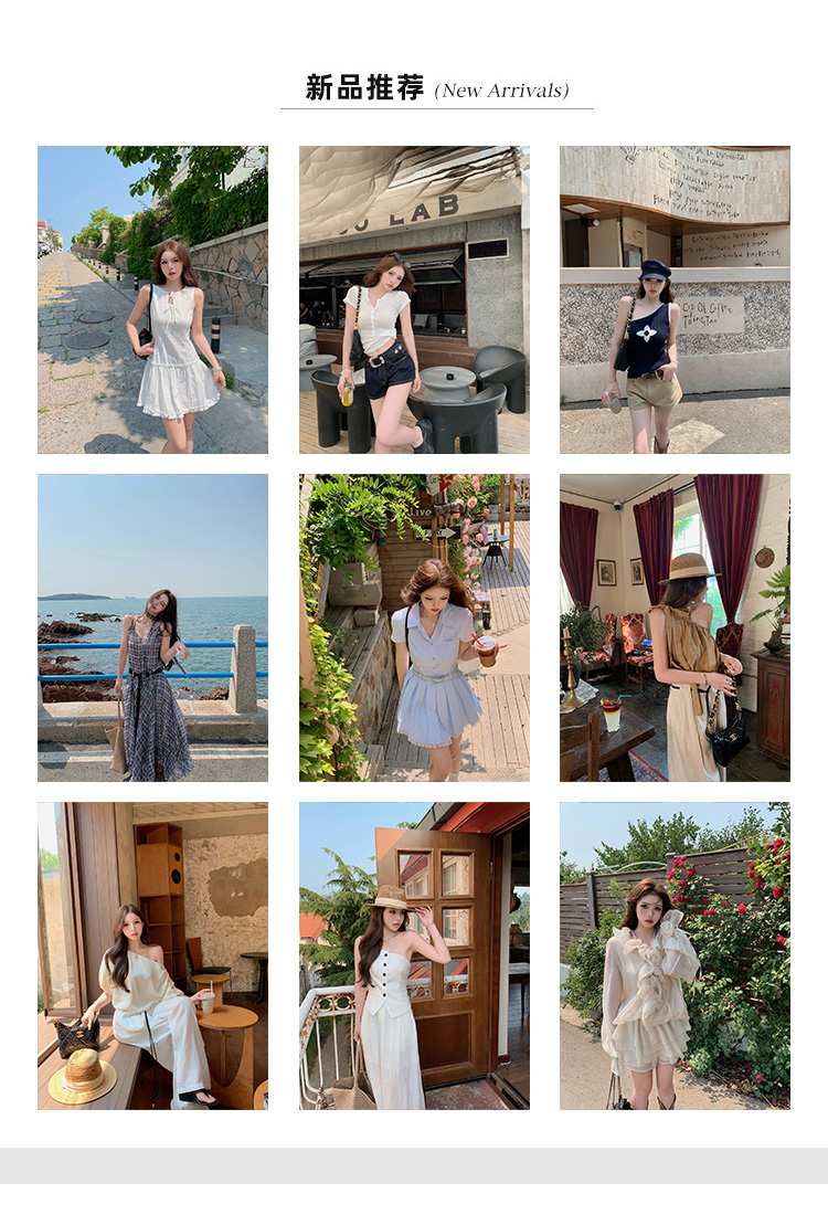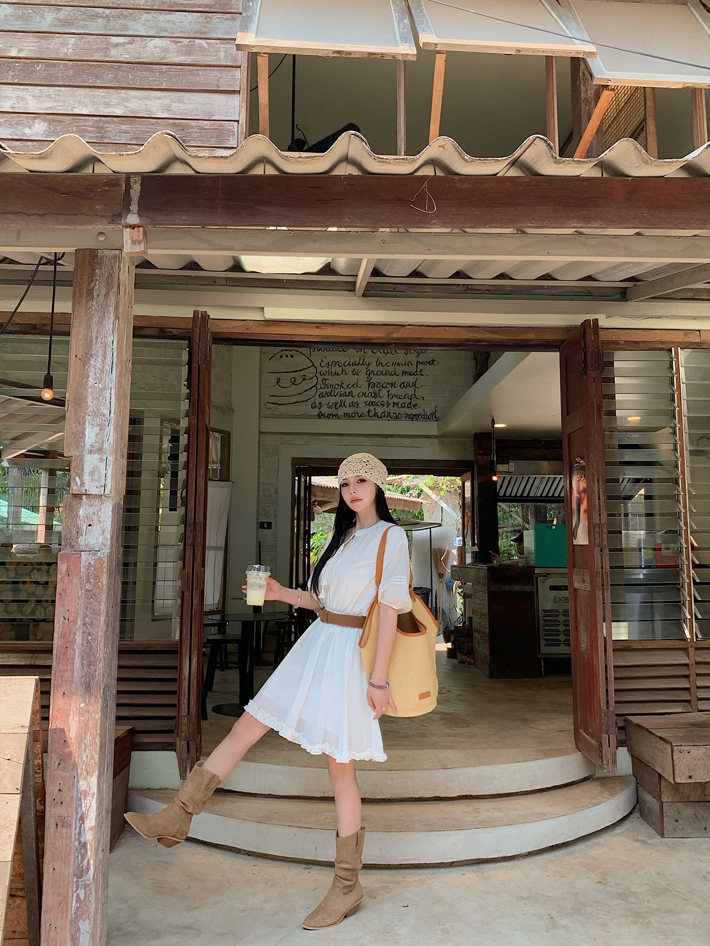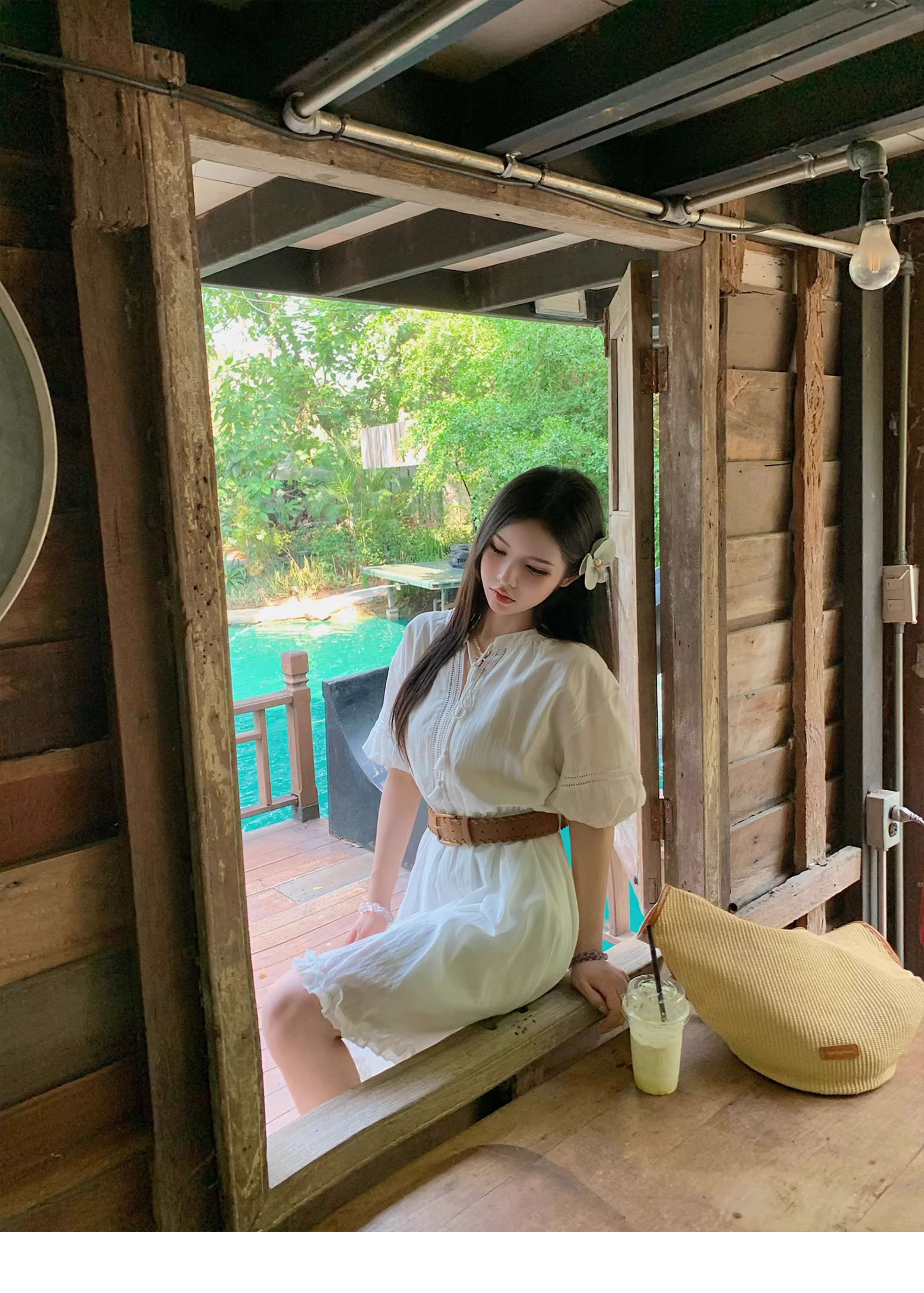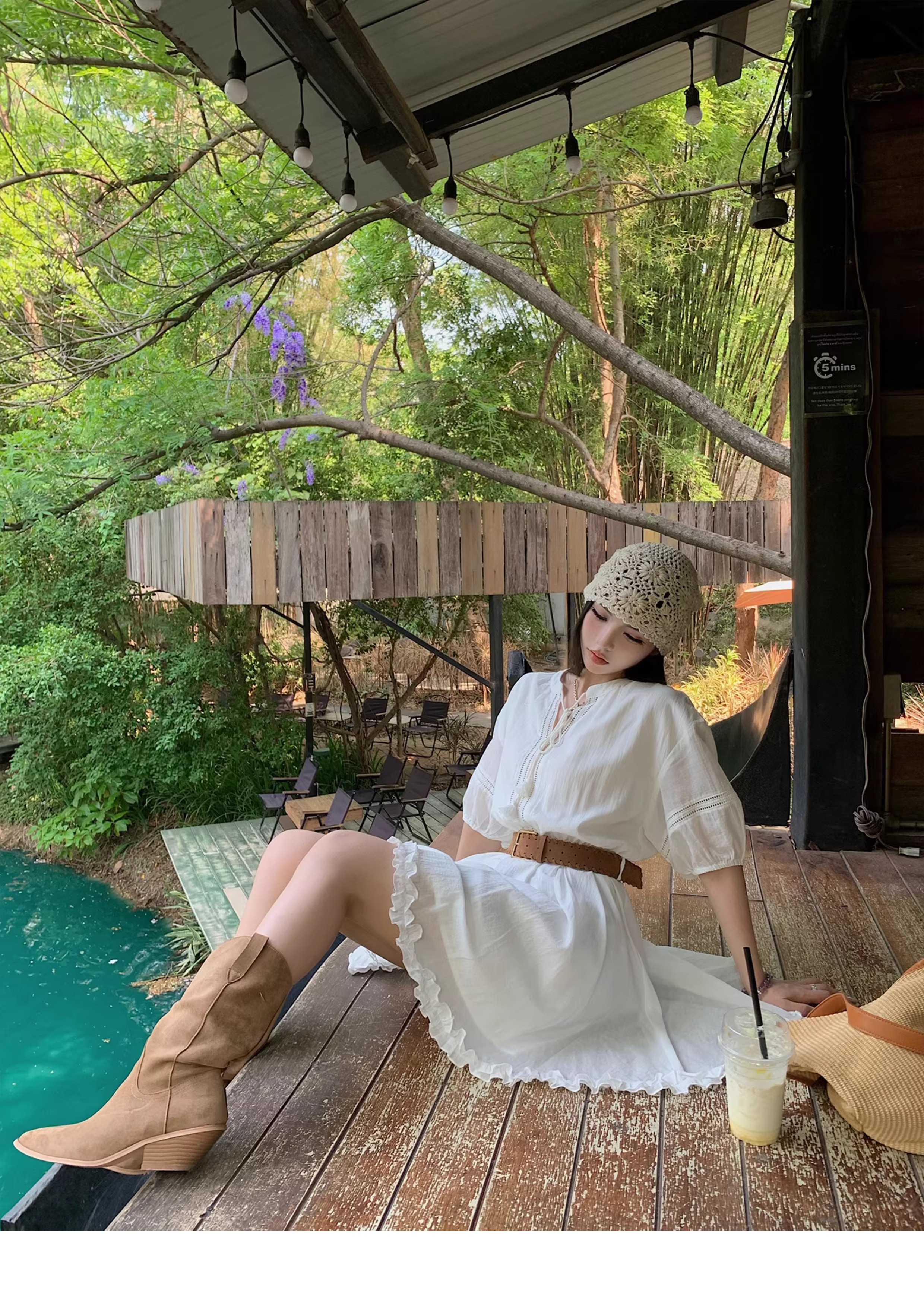 onelady 波西米亞v領系帶連衣裙女夏季新款白色收腰重工度假短裙
