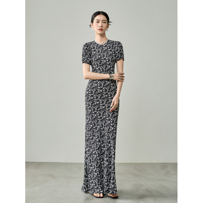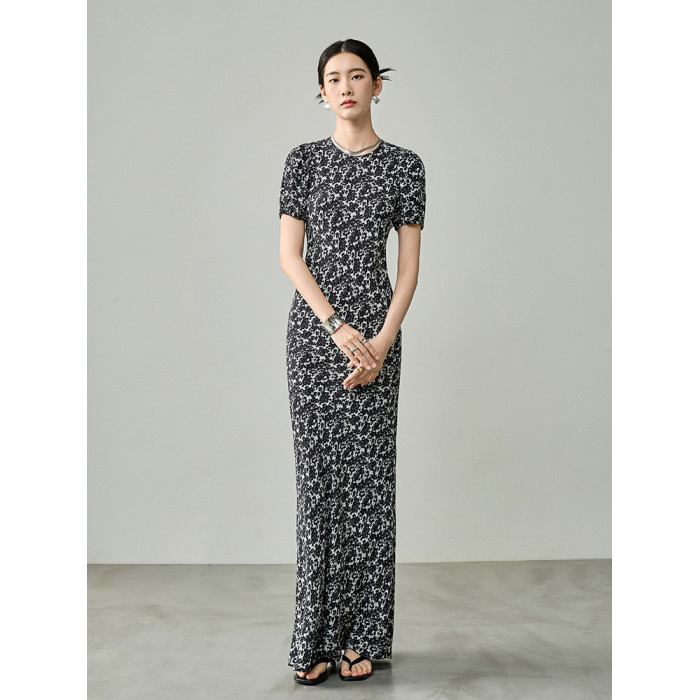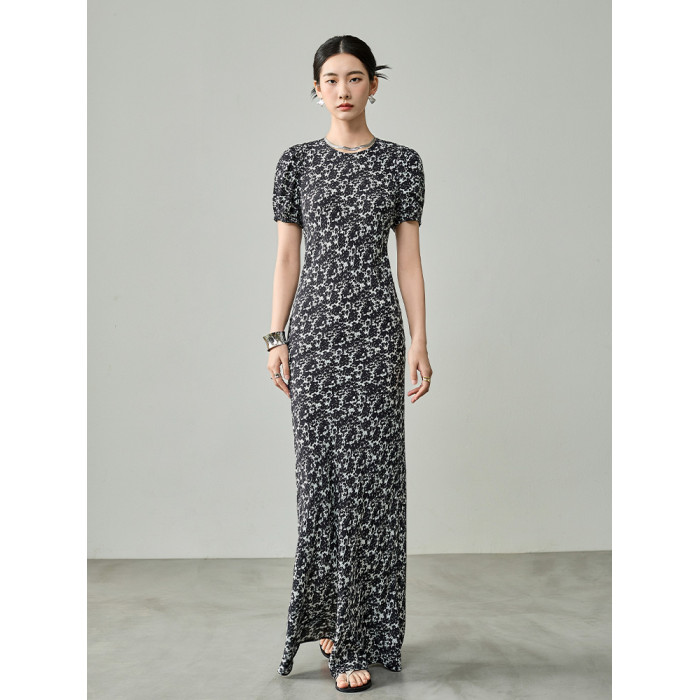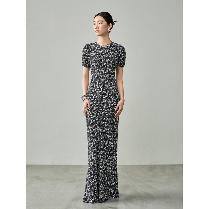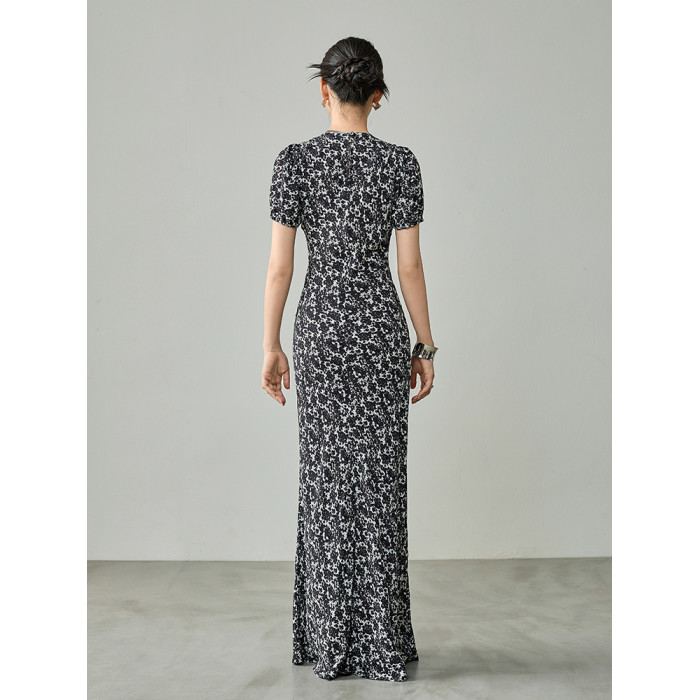 碎花長裙時髦氣質圓領清冷老錢斜裁魚尾裙泡泡袖修身優雅連衣裙