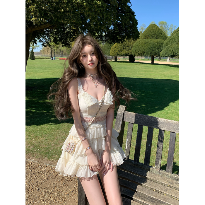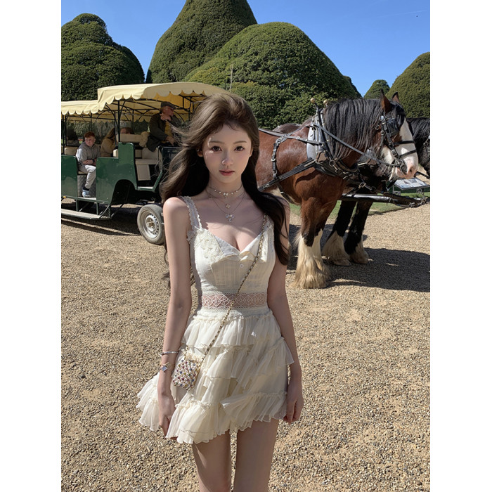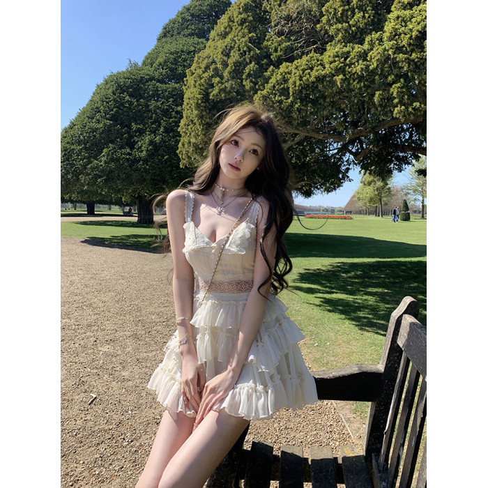 法式純欲蕾絲拼接吊帶連衣裙子女氣質收腰設計感度假風蛋糕裙夏季