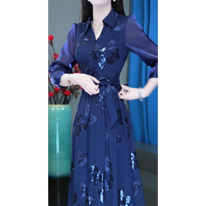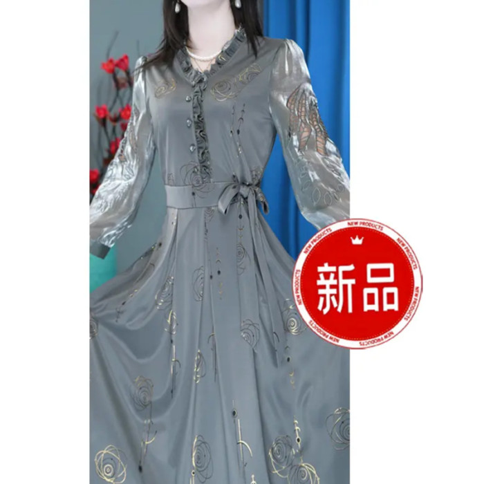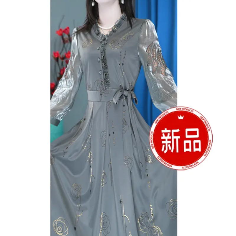夢莎姿襯衫領印花連衣裙女2025年春季新款收腰顯瘦媽媽裝a字裙子