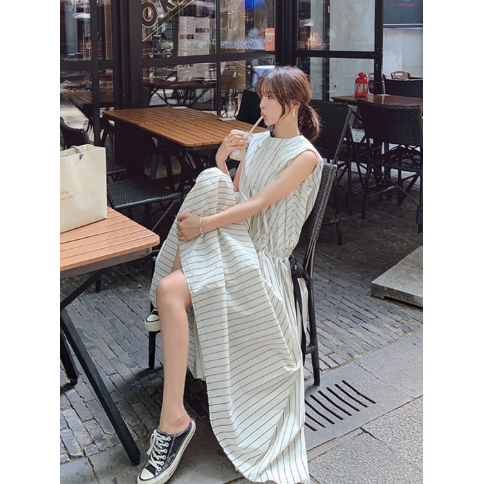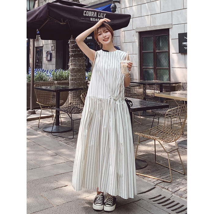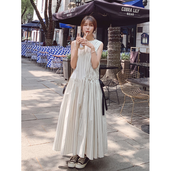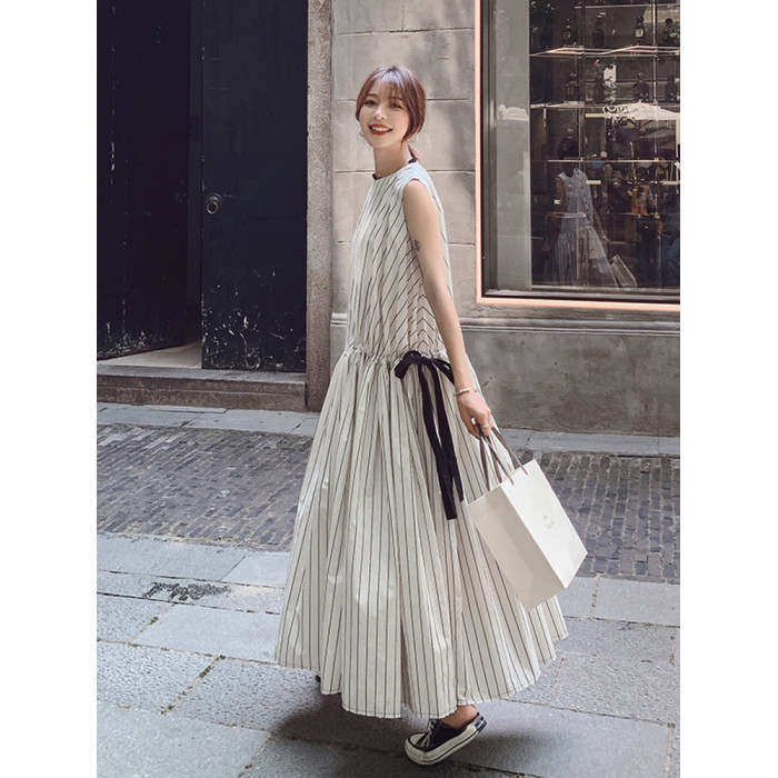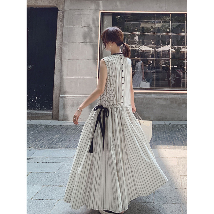 2025夏季新款女裝法式復古白色無袖連衣裙顯瘦氣質溫柔風條紋長裙