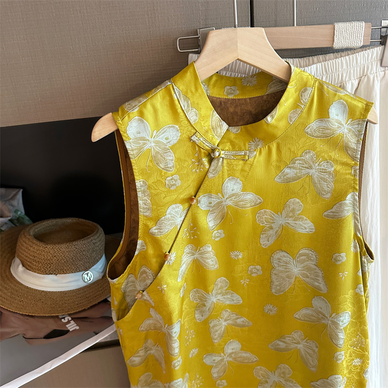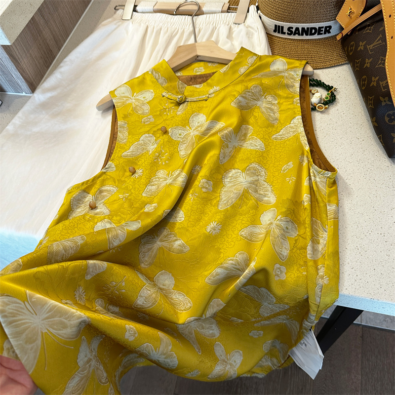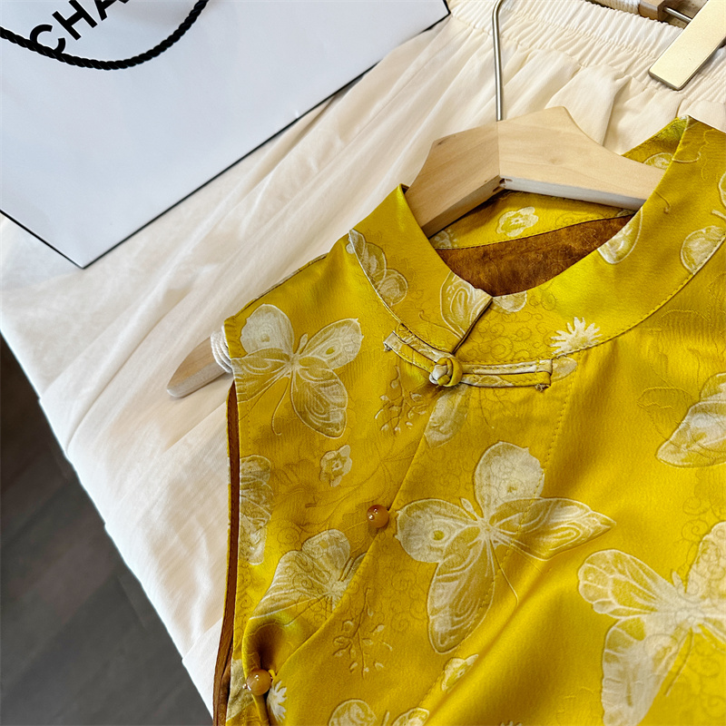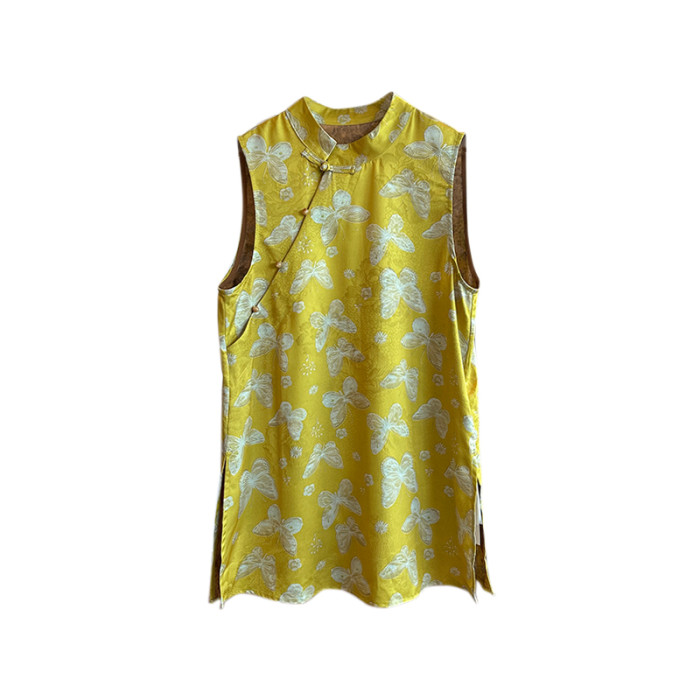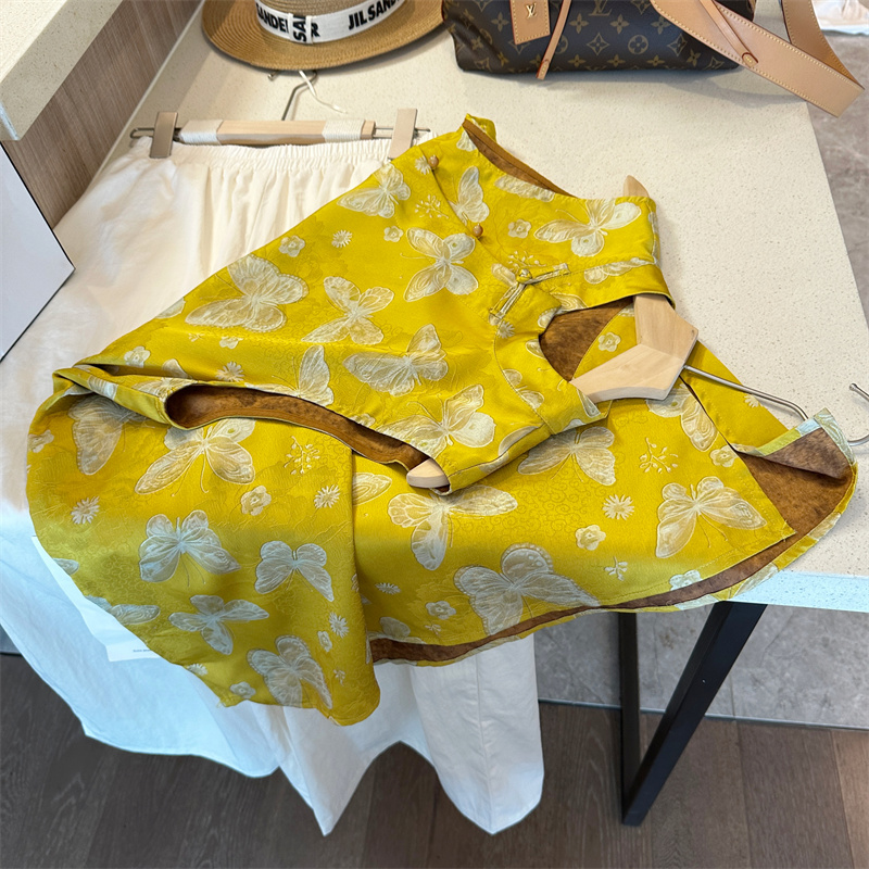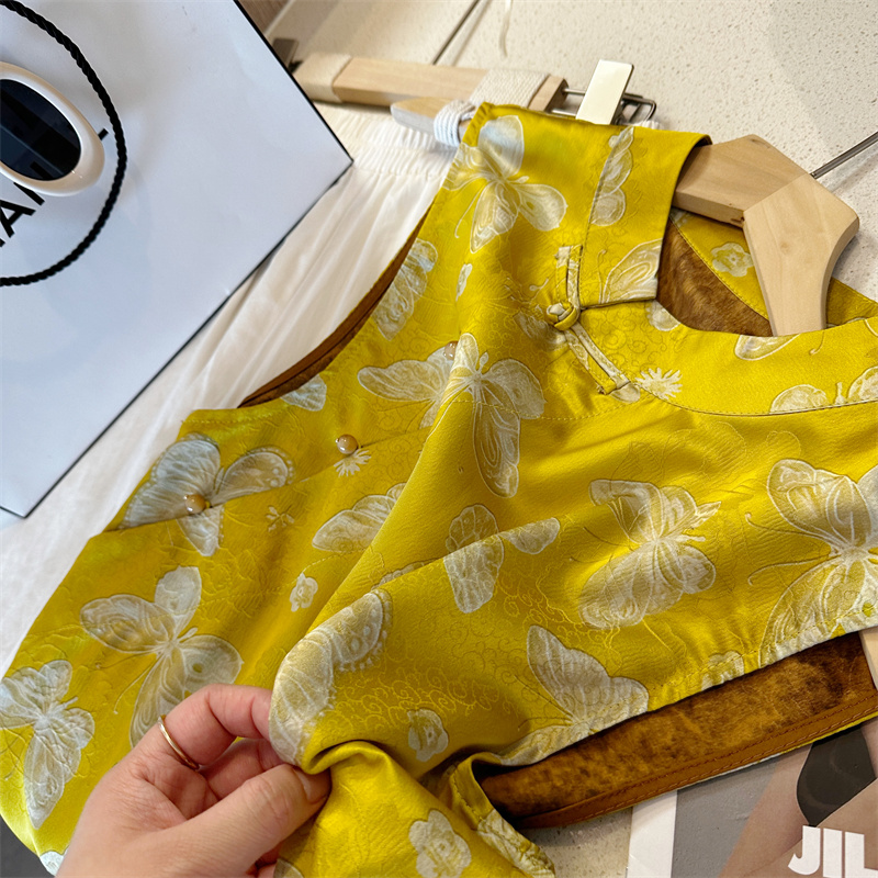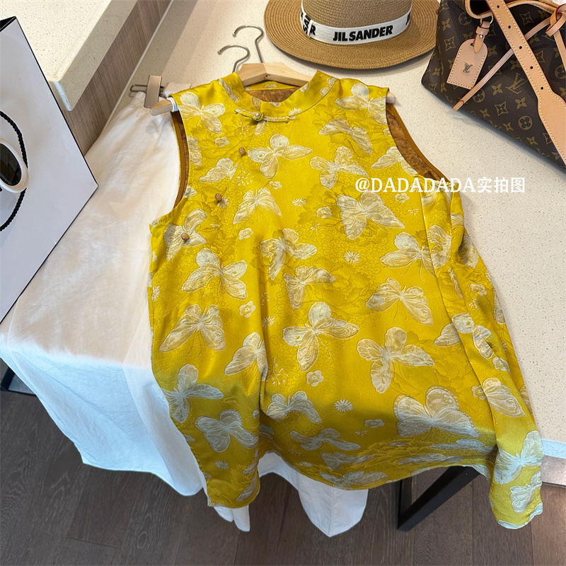 新中式國風盤釦無袖背心連衣裙夏季氣質設計感蝴蝶印花a字短裙潮