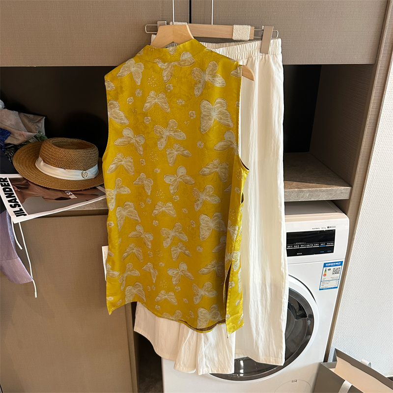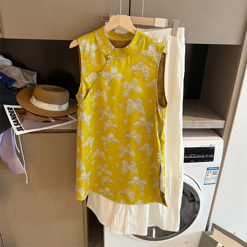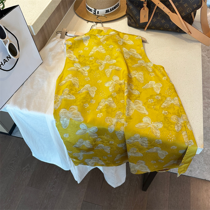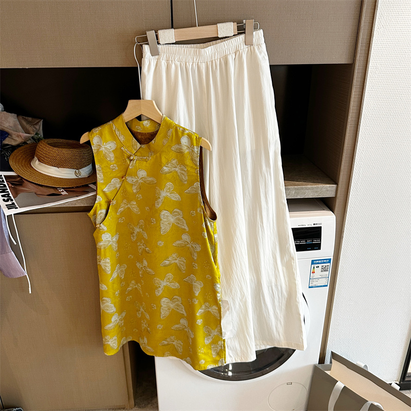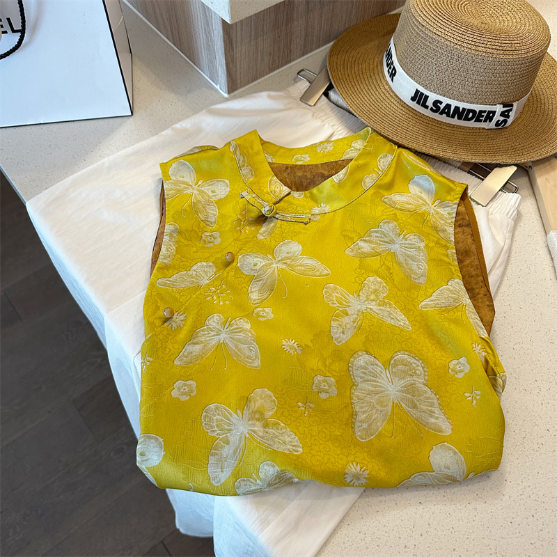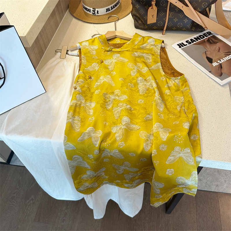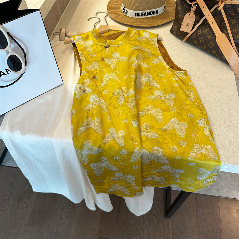 新中式國風盤釦無袖背心連衣裙夏季氣質設計感蝴蝶印花a字短裙潮