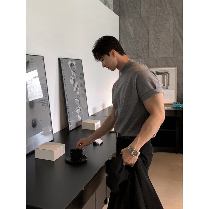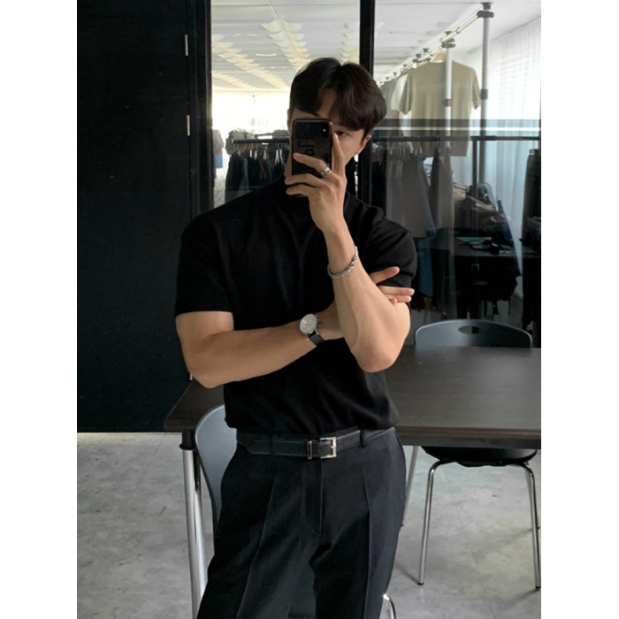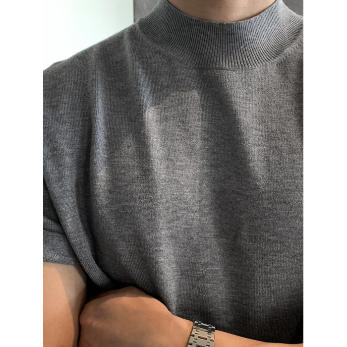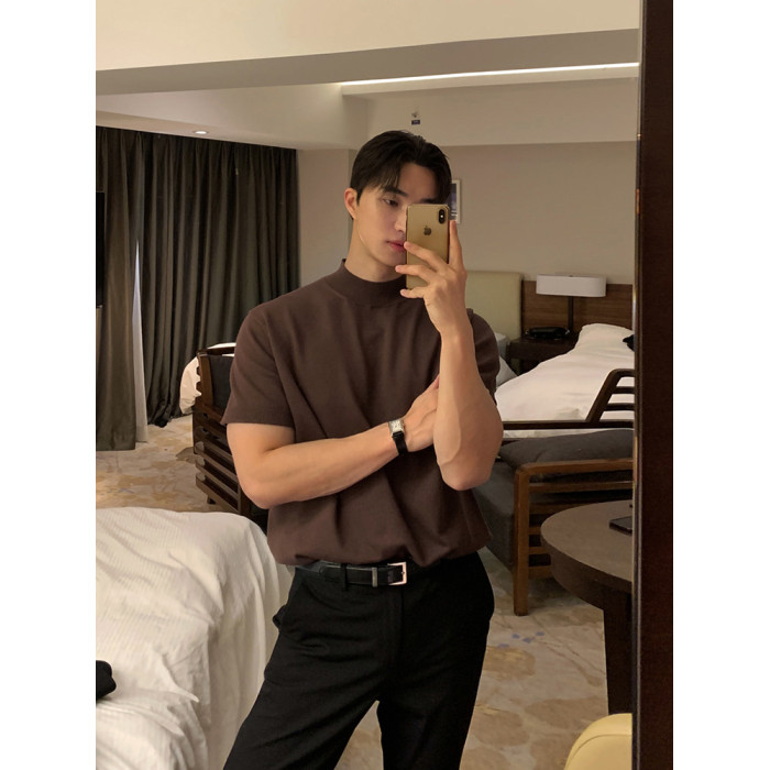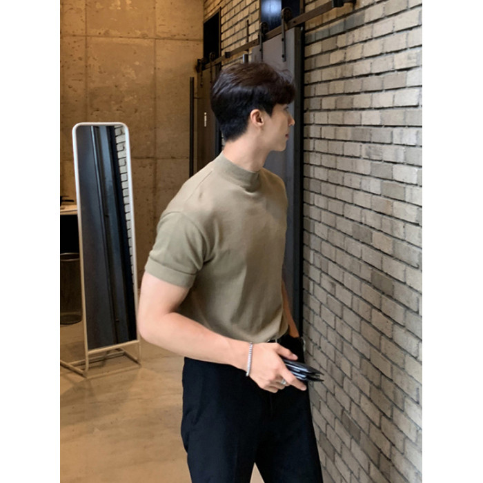 碧捨韓版男士高級感針織衫休閒寬松百搭短袖透氣輕熟半高領打底衫