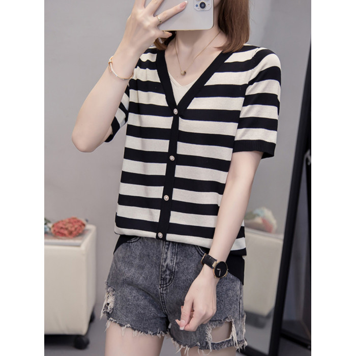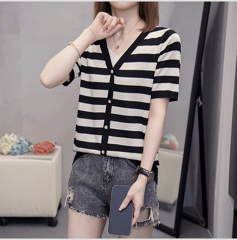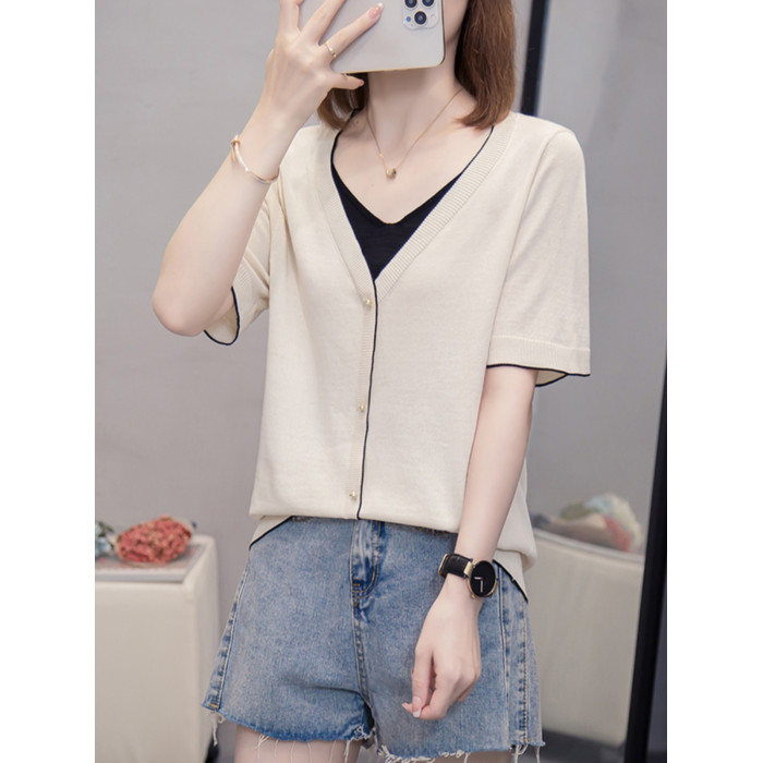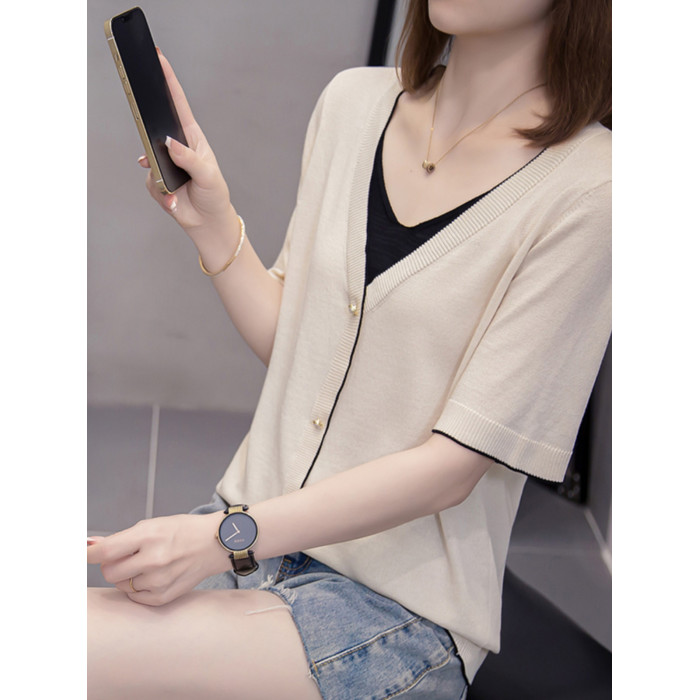 胖mm遮肚子顯瘦v領假兩件冰絲短袖打底衫女夏季洋氣減齡正肩上衣