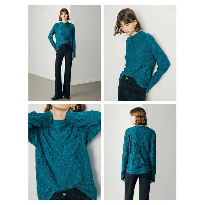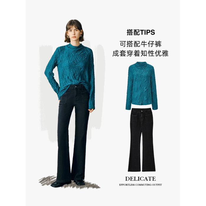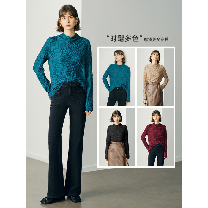 顔域藍色長袖打底衫女士2024新款秋季簡約通勤半高領長袖寬松上衣