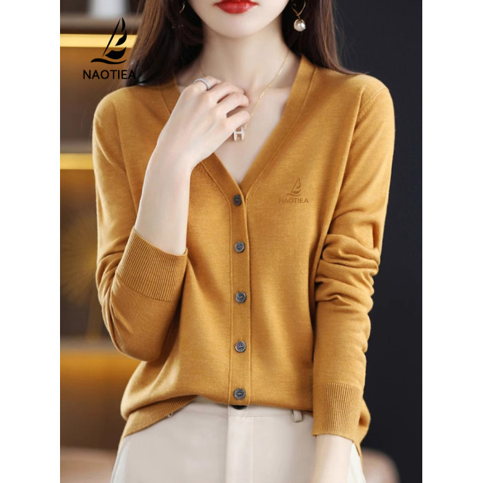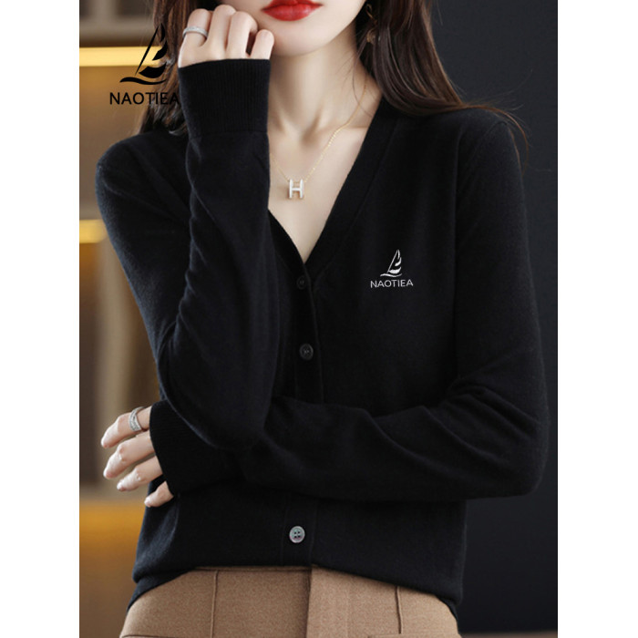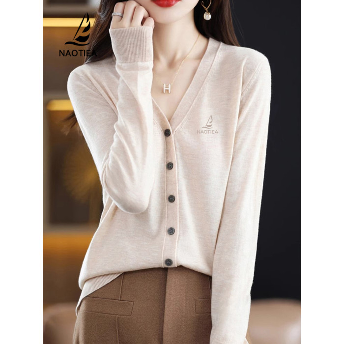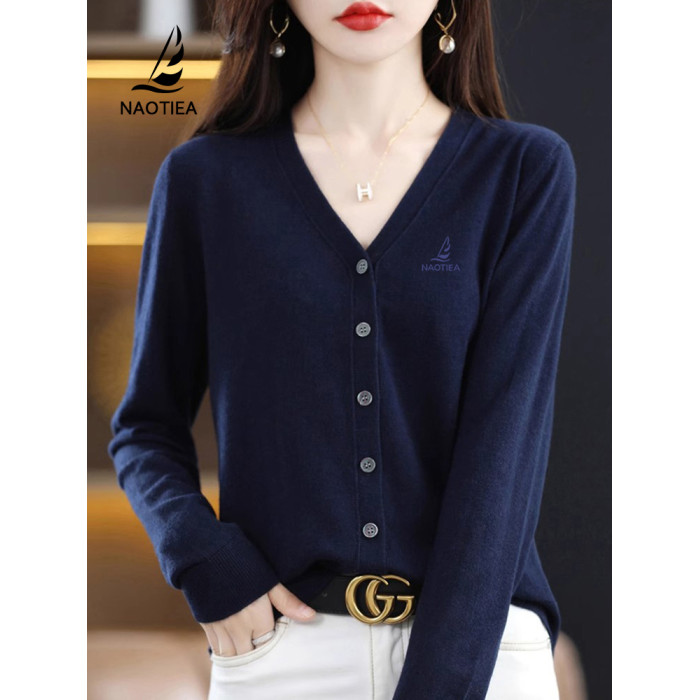 納奧蒂爾小帆船V領針織衫女2025春秋新款純色薄款開衫毛衣外套