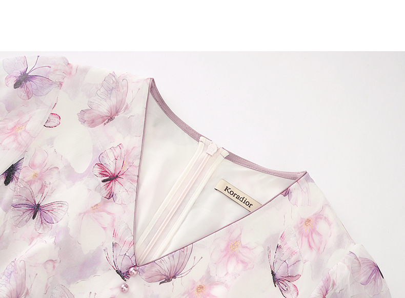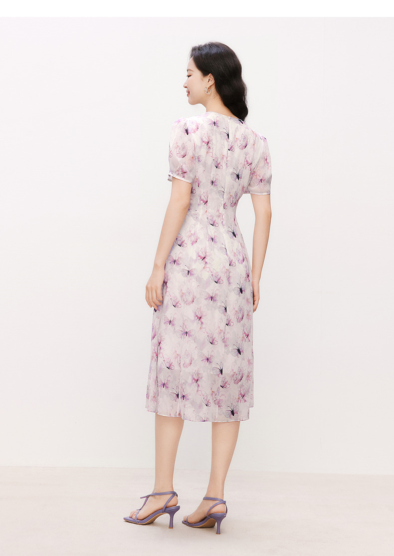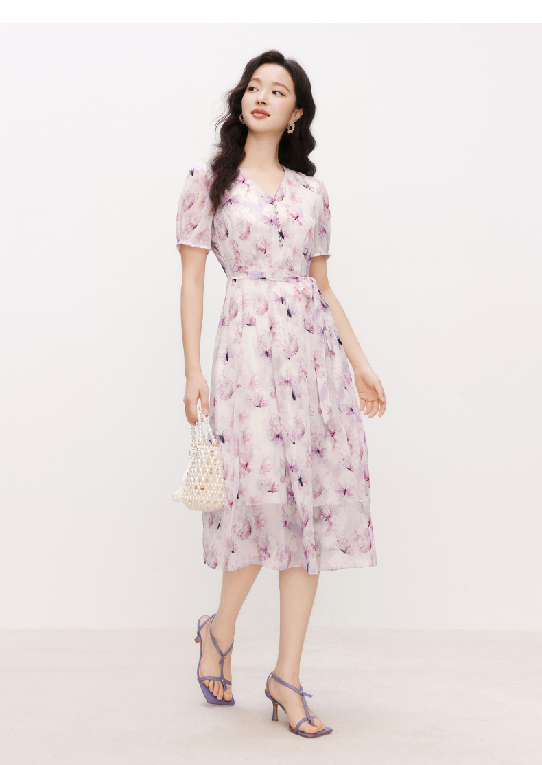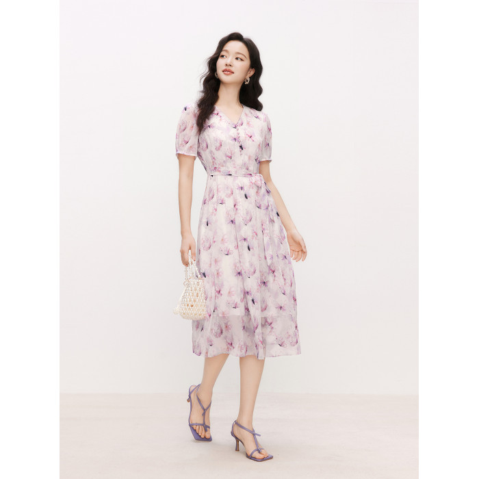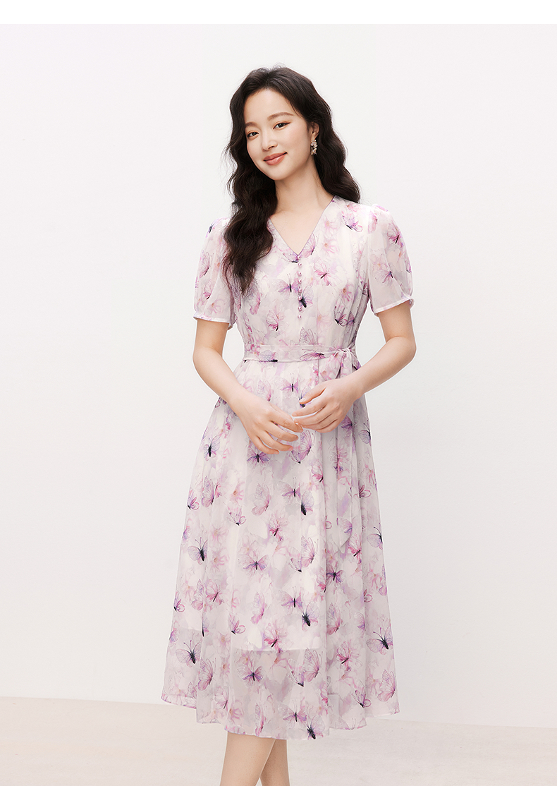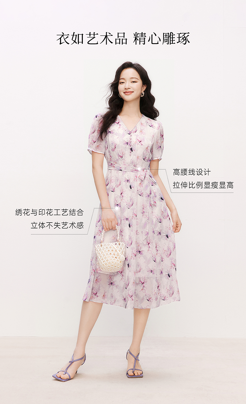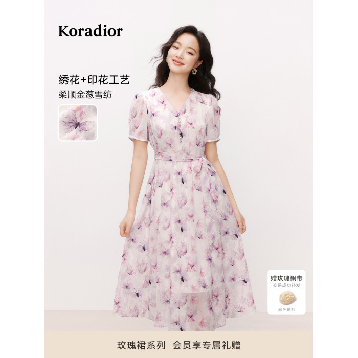 【玫瑰裙】珂萊蒂爾2025夏季新款氣質茶歇裙女蝴蝶碎花優雅連衣裙