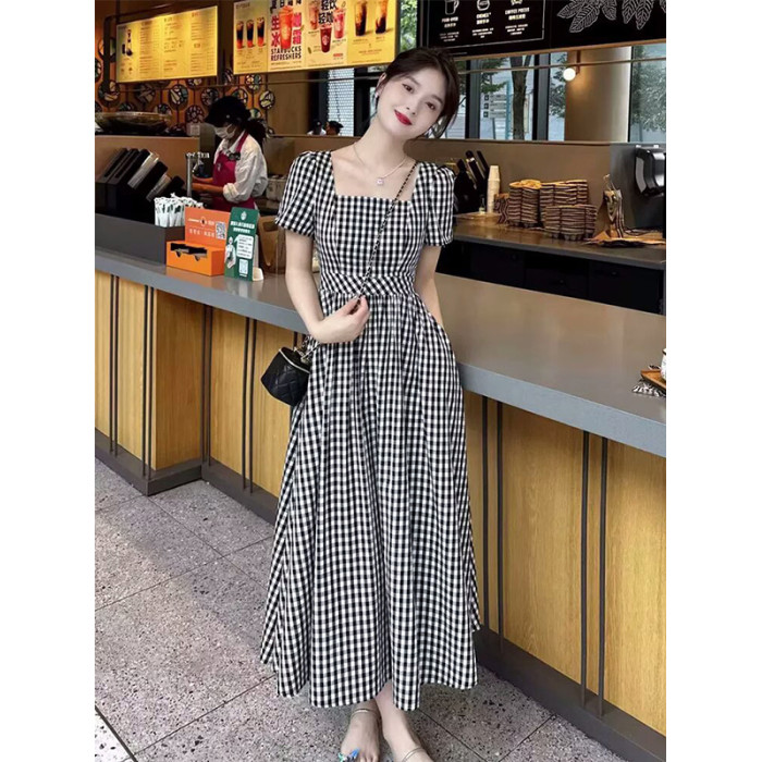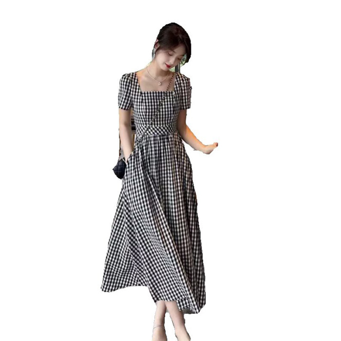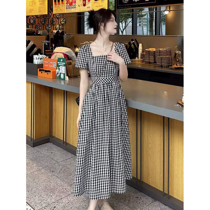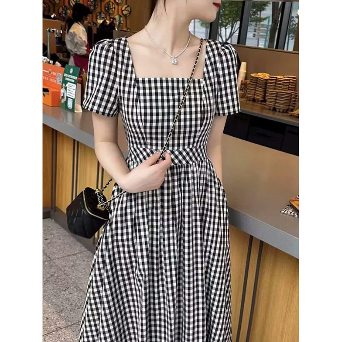 歐洲站2025新款法式赫本風氣質長裙減齡顯瘦格子方領連衣裙女夏季
