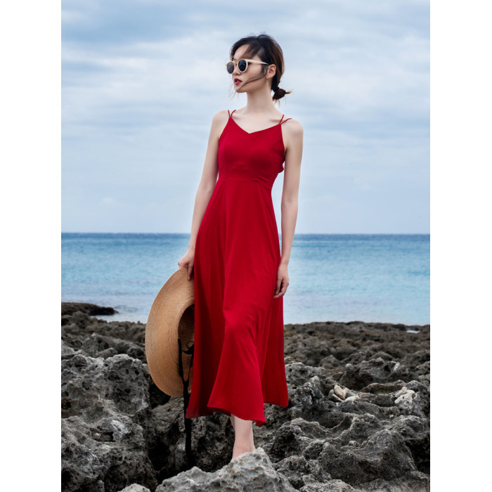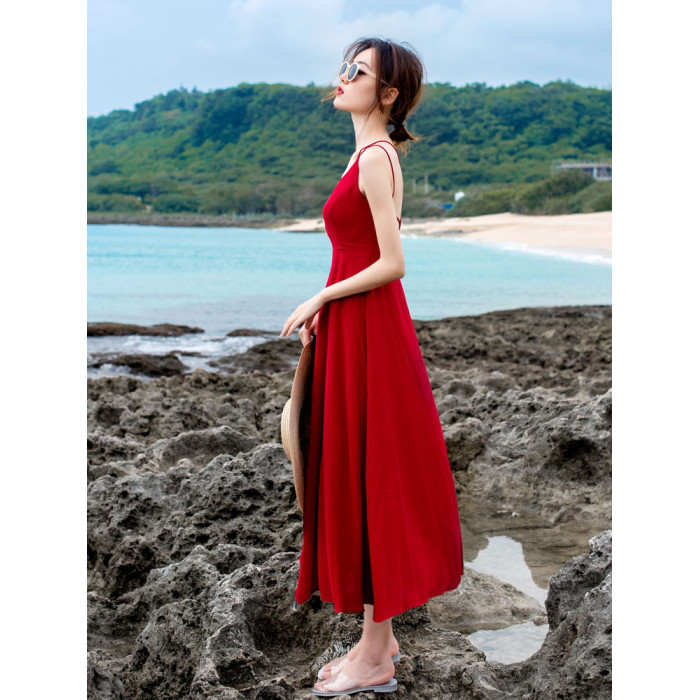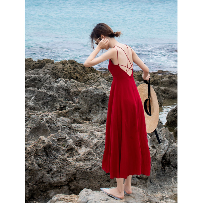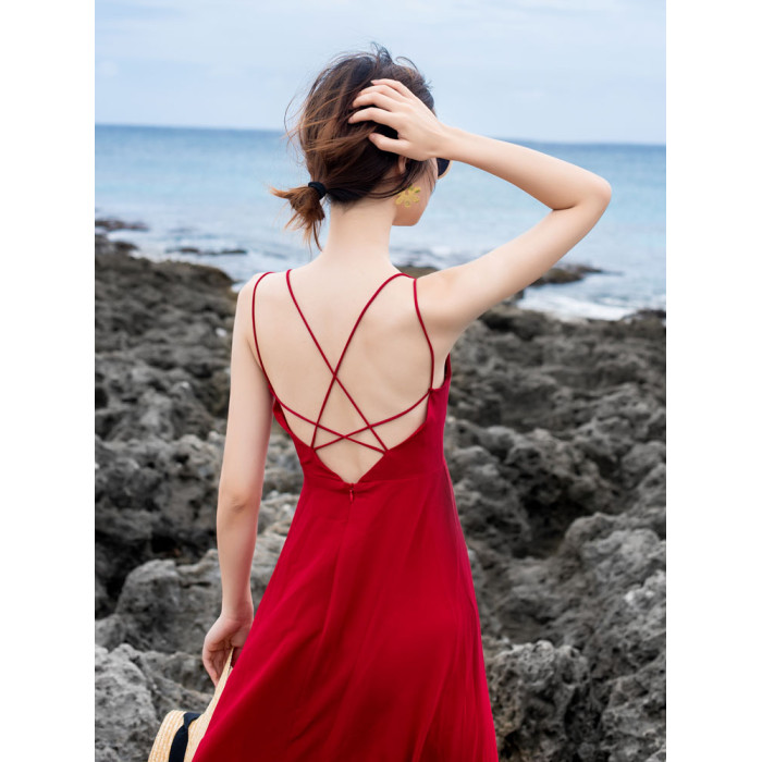 紅色露背吊帶胸墊連衣裙女三亞絕美穿搭性感海邊度假沙灘裙高級感