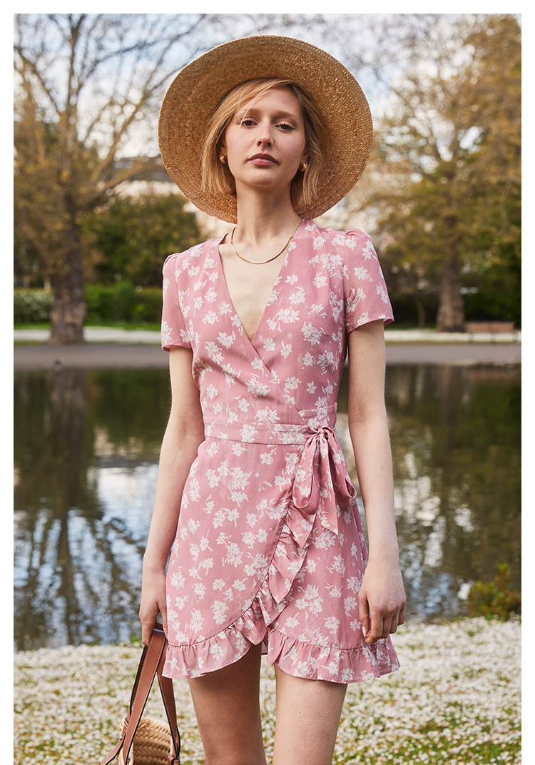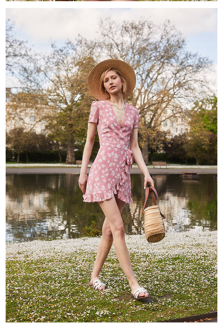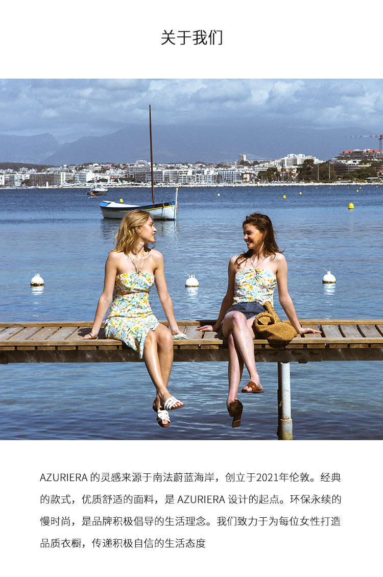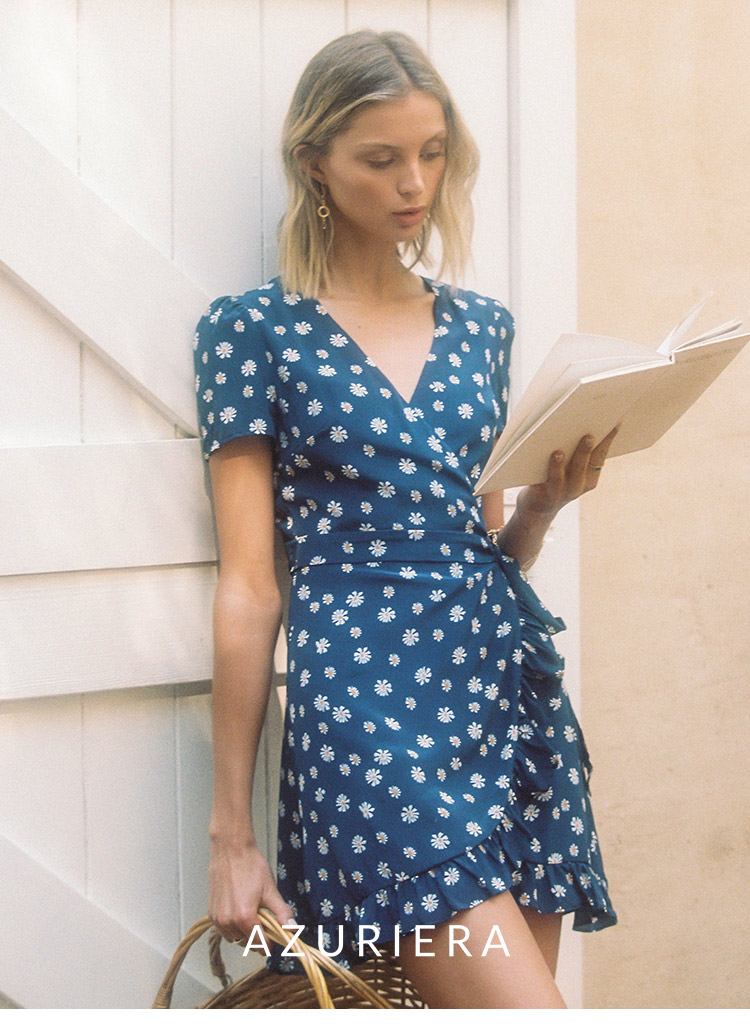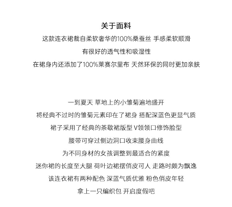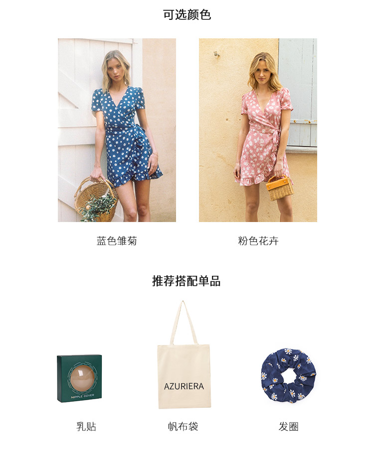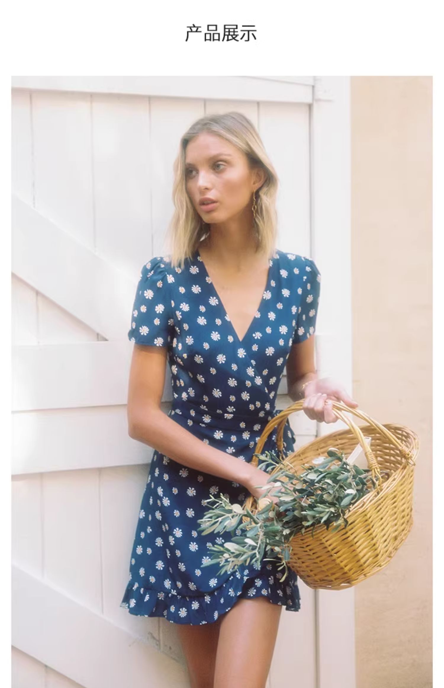 【張婧儀同款】AZURIERA藍色小雛菊短袖連衣裙高腰桑蠶絲碎花裙子