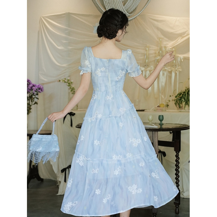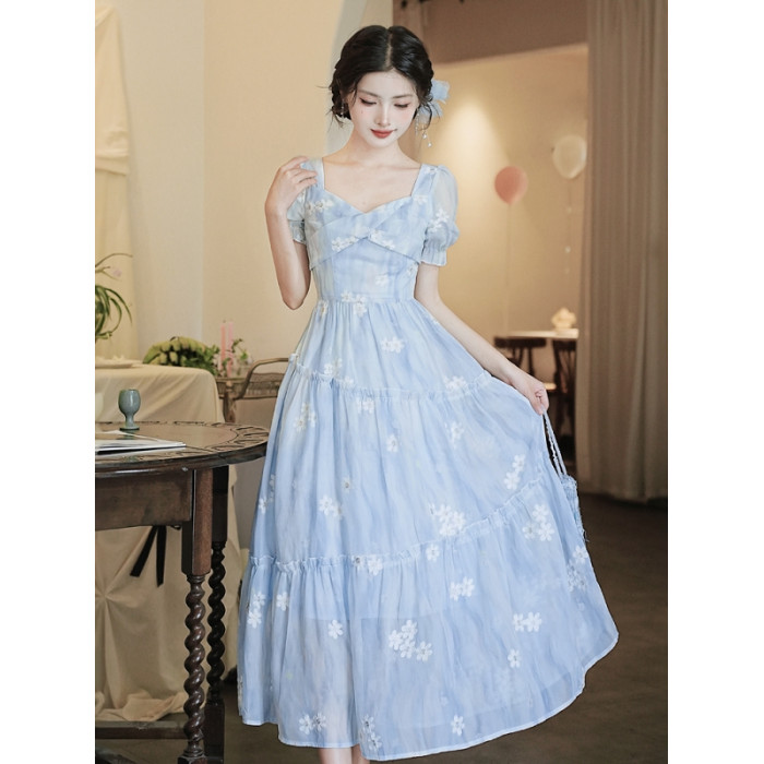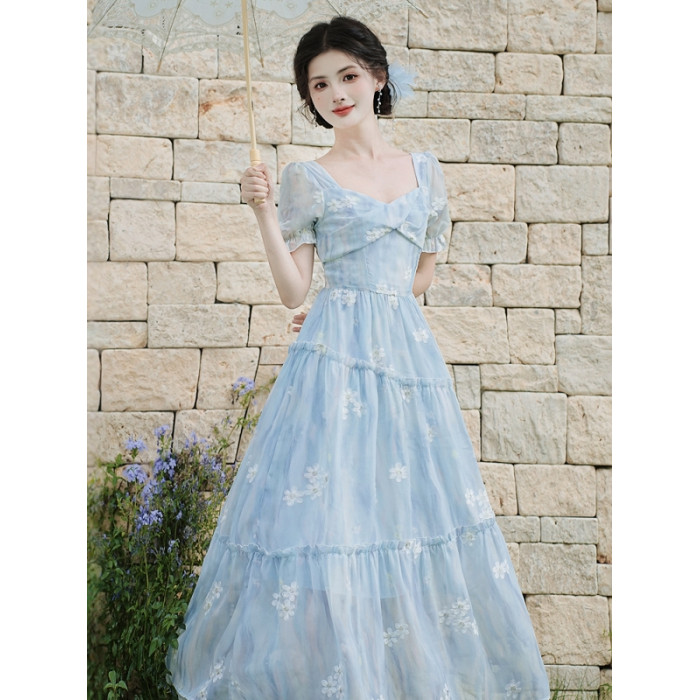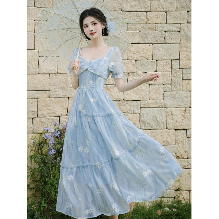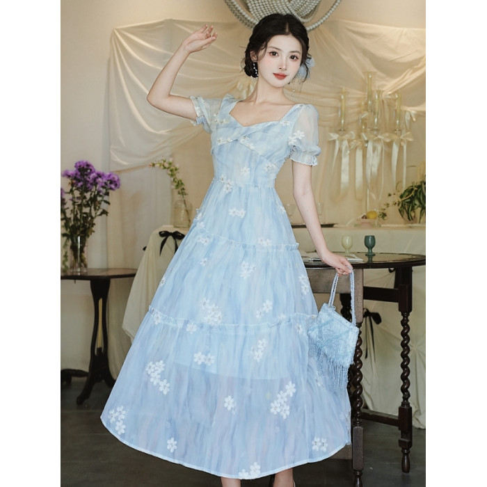 夏日絕美小裙子法式甜美氣質藍色碎花連衣裙獨特漂亮收腰顯瘦長裙