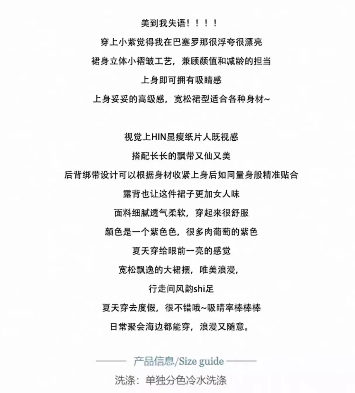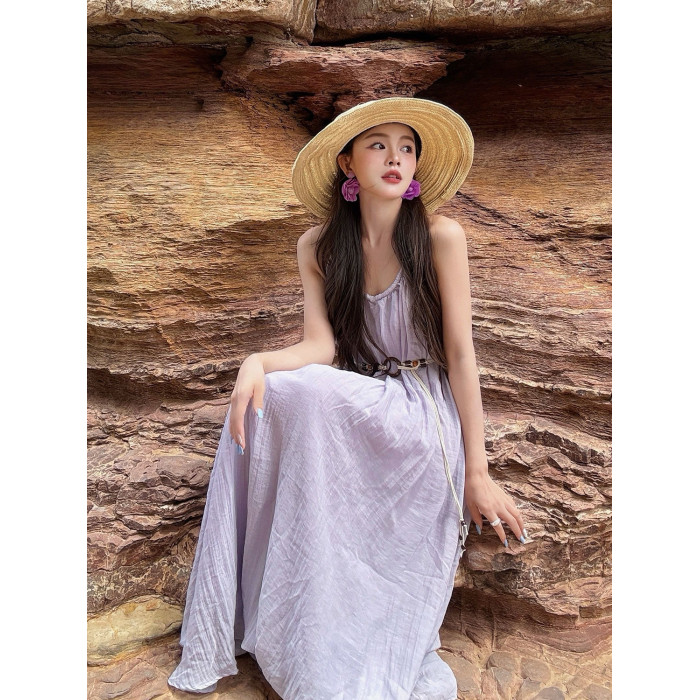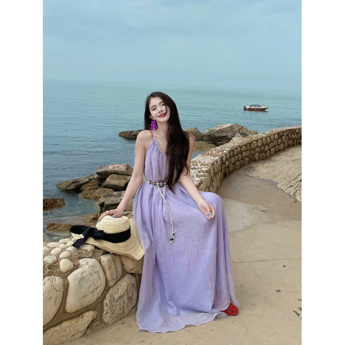 法式旅遊海邊度假風氣質掛脖吊帶連衣裙女夏季設計感寬松紫色長裙
