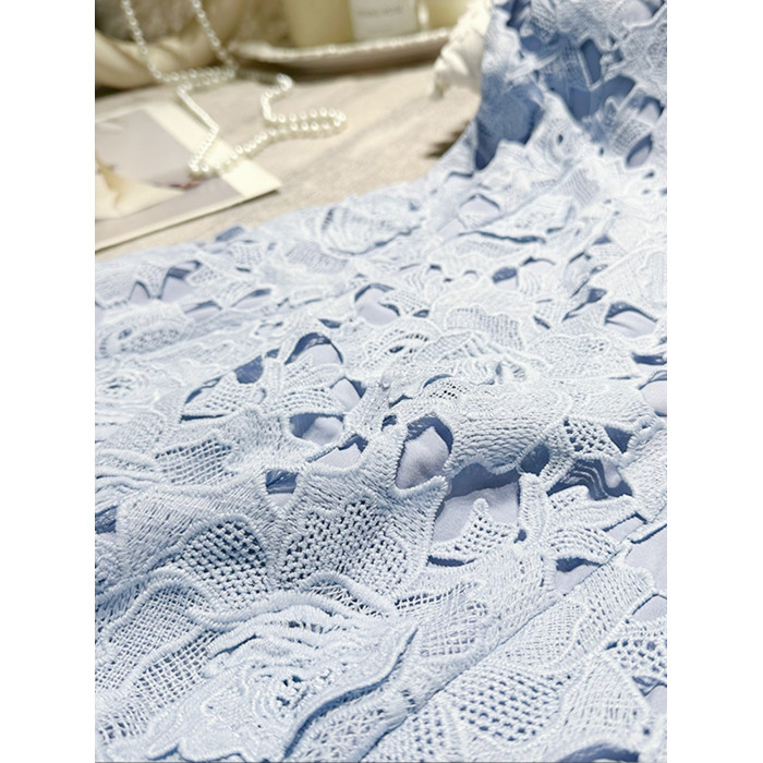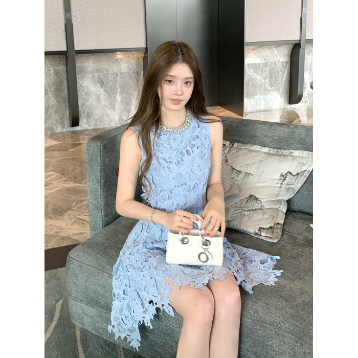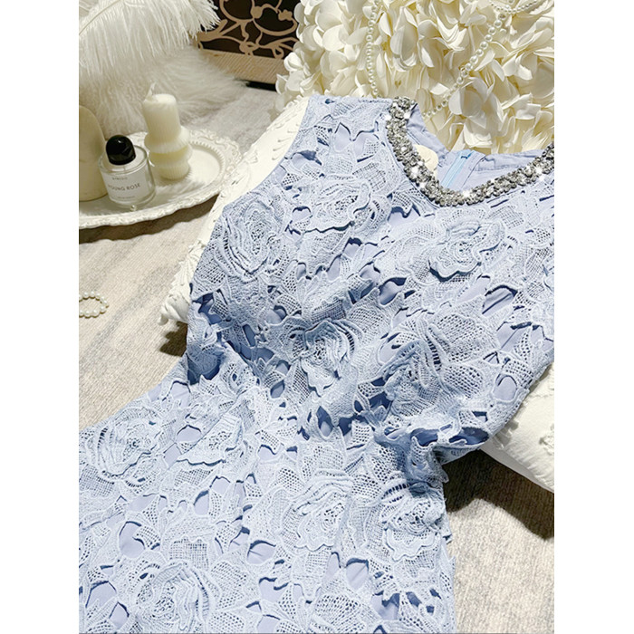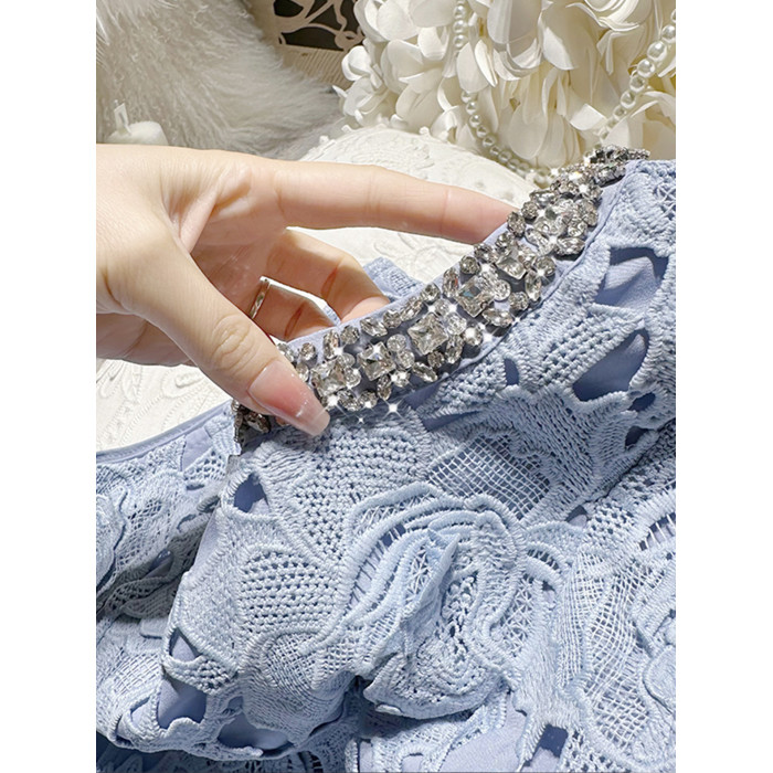 FFmiss◆高級感鑲鑽鏤空花朵蕾絲連衣裙女夏法式釘珠洋氣收腰短裙