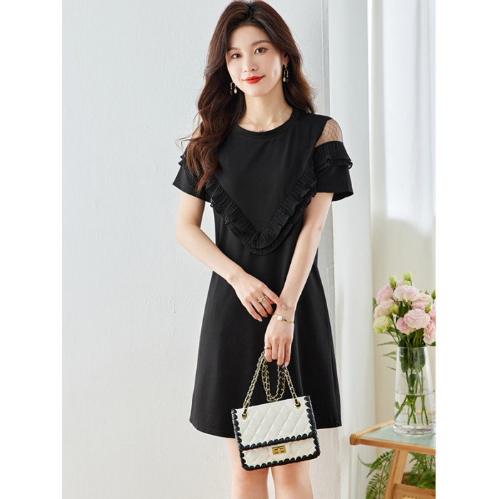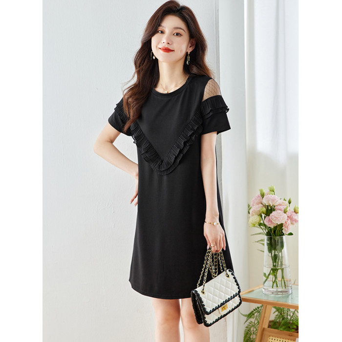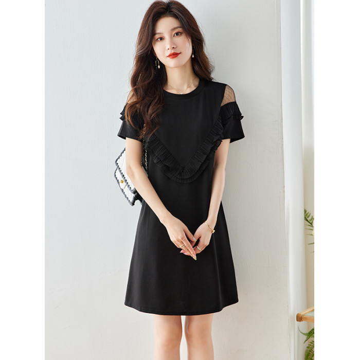 高級氣質真絲短袖連衣裙女夏季新款收腰中長款桑蠶絲小個子黑裙子