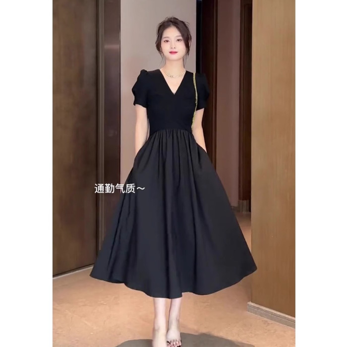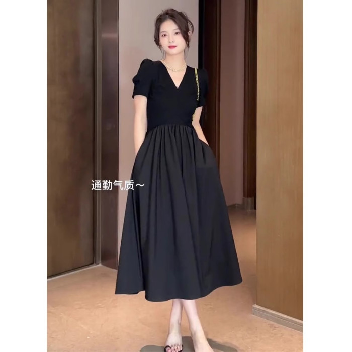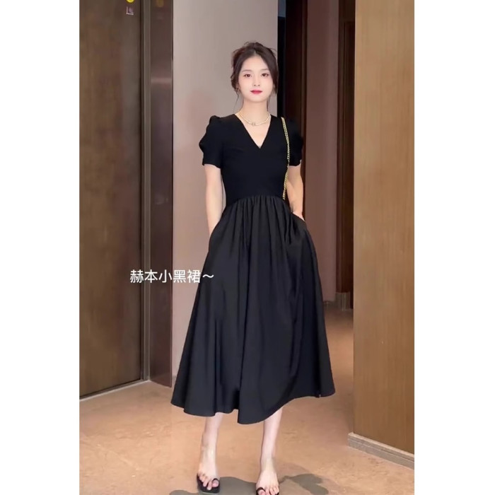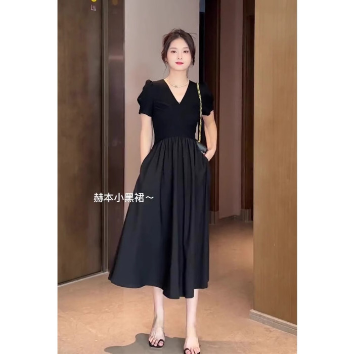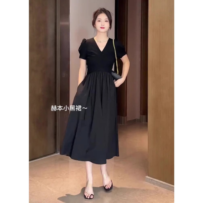 歐洲站夏季新款女裝法式氣質女神範禦姐赫本風收腰黑色連衣裙子夏