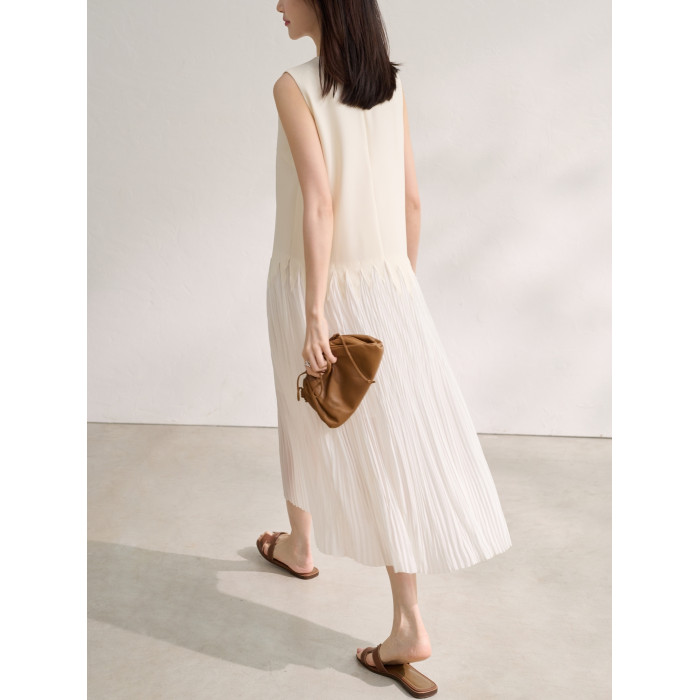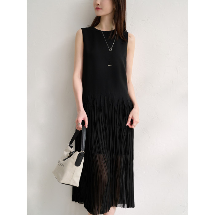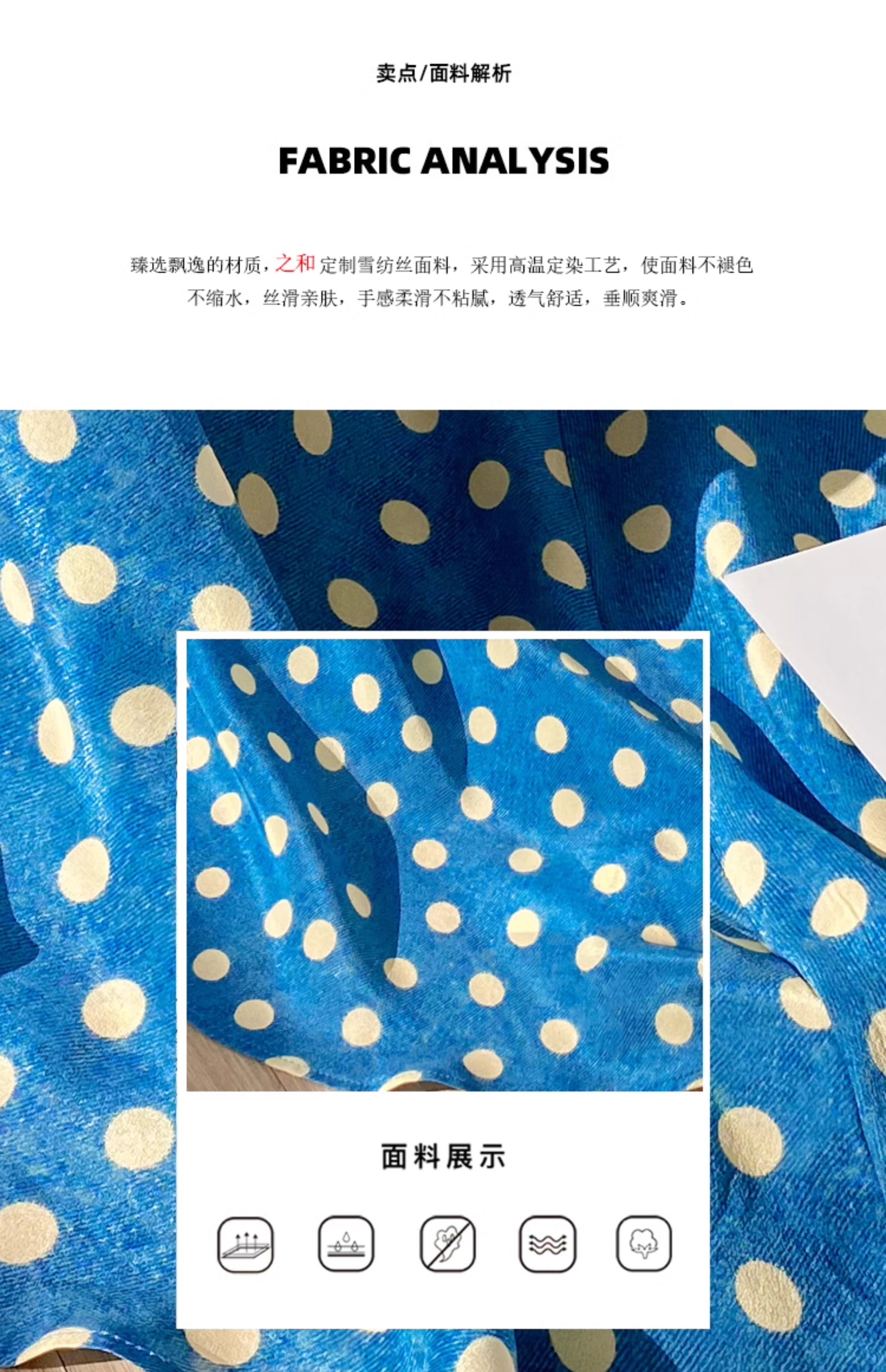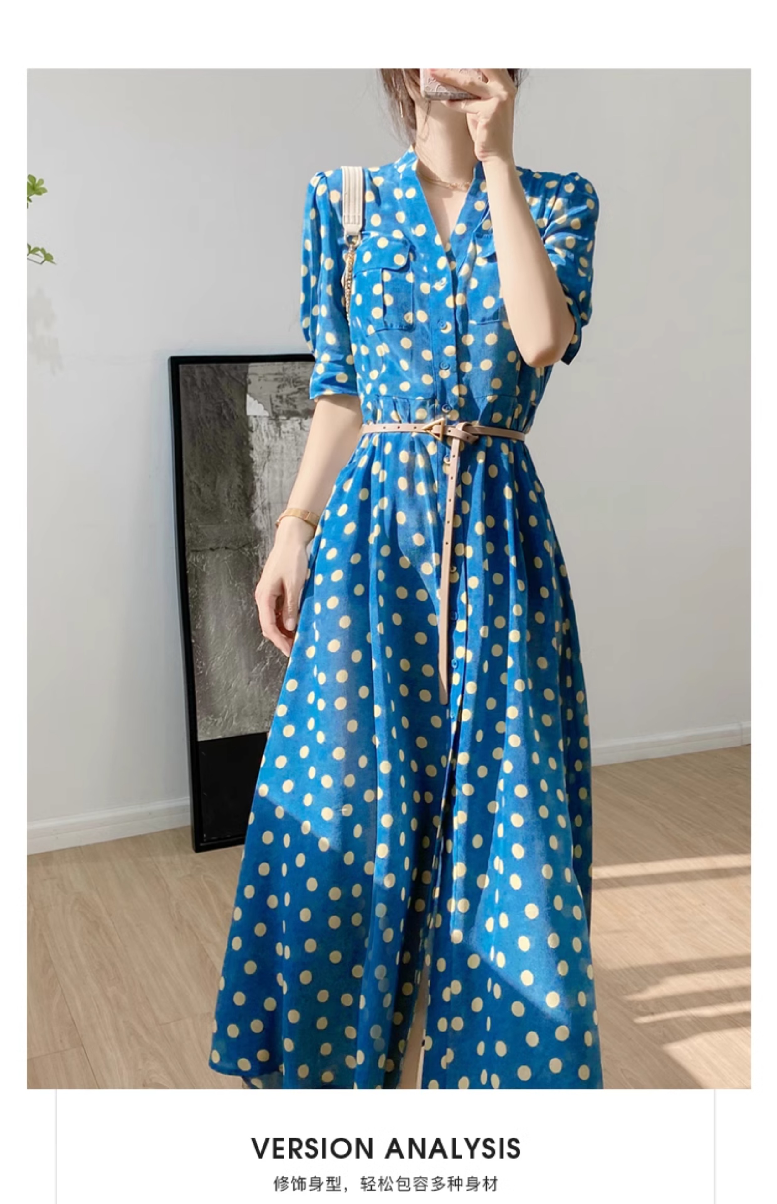 法式復古藍色波點雪紡長裙連衣裙女五分袖立領收腰系帶顯瘦長裙夏