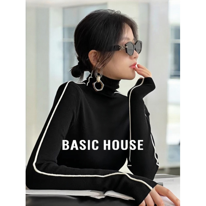 Basic House/百家好法式黑色撞色高領針織打底衫女早秋內搭可外穿