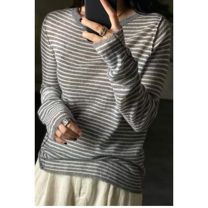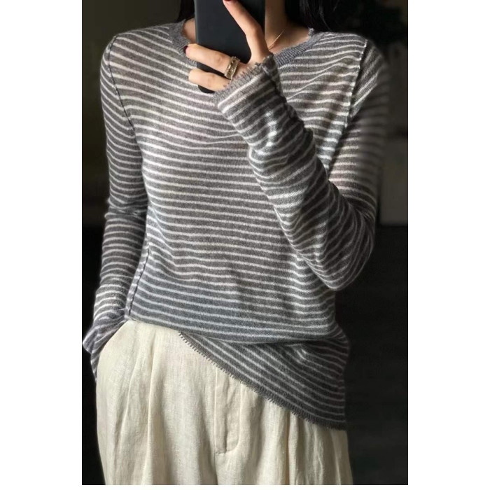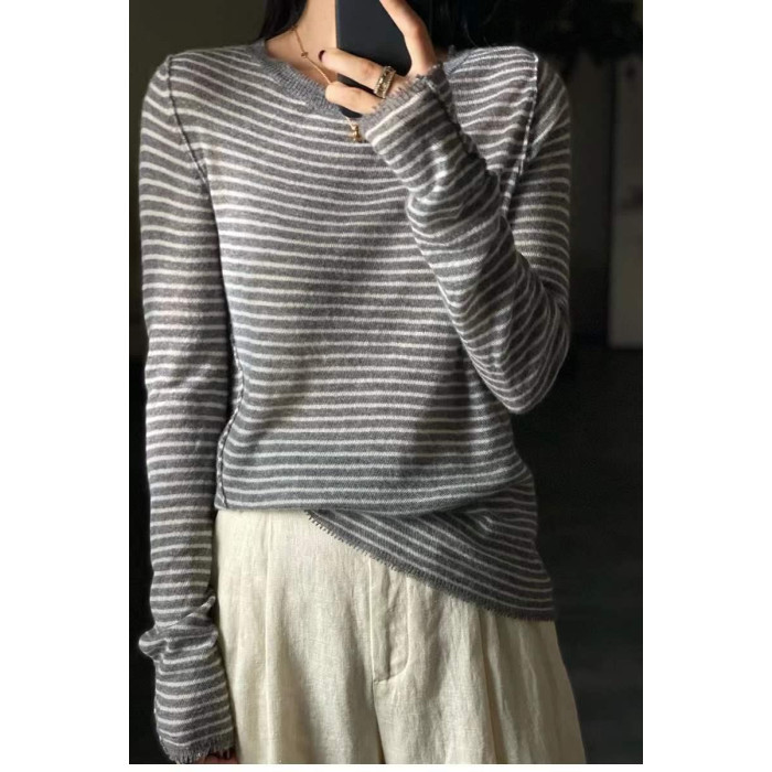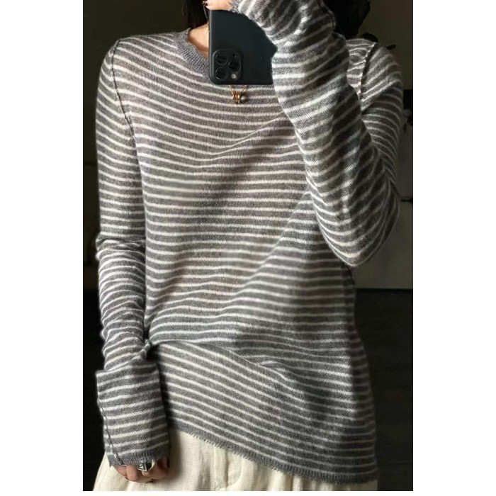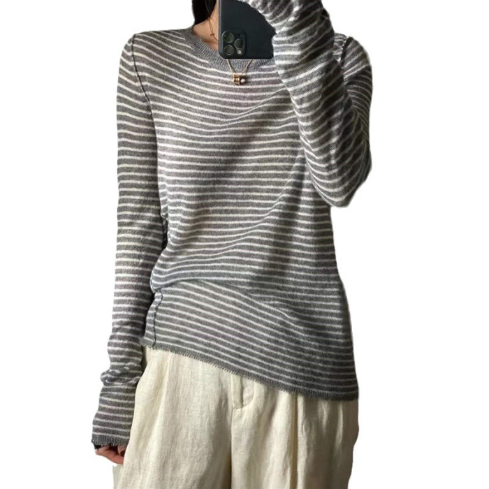 歐洲站春秋薄款羊絨衫女寬松條紋軟糯毛衣針織打底衫百搭上衣顯瘦