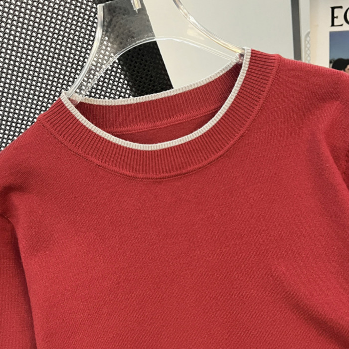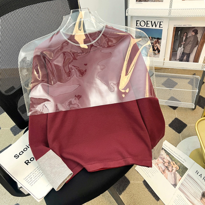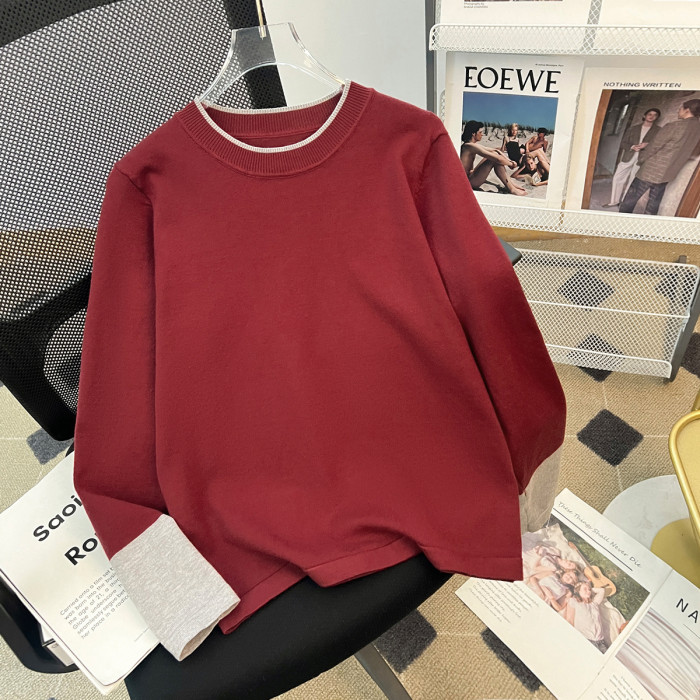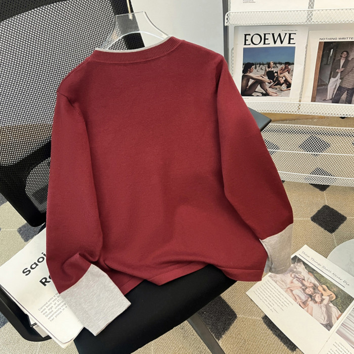 【藝術旅途】撞色圓領長袖針織衫女春秋新款設計感拼色內搭打底衫