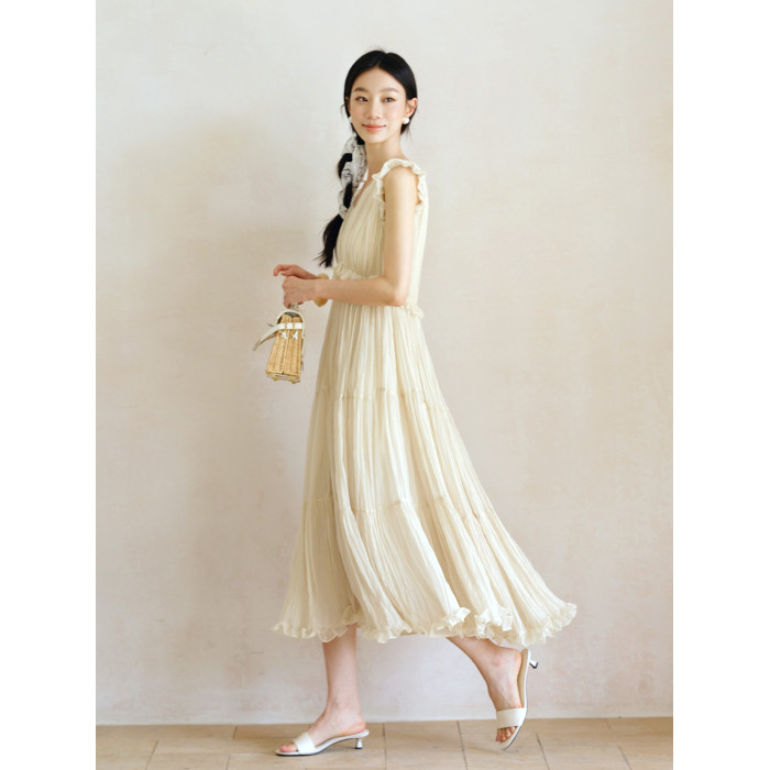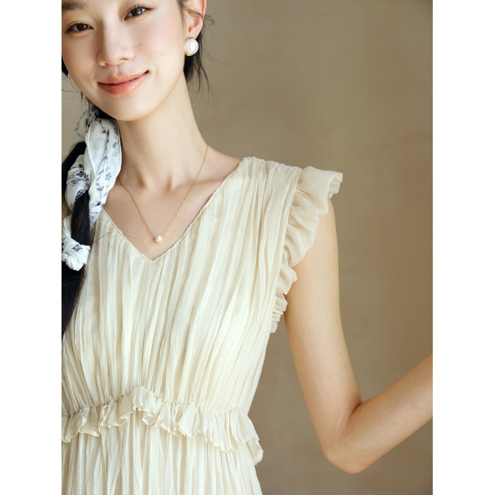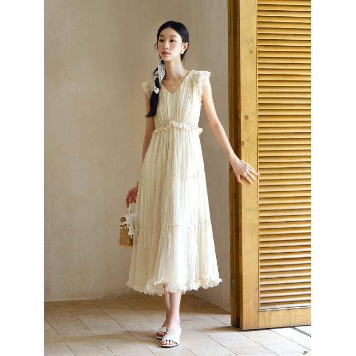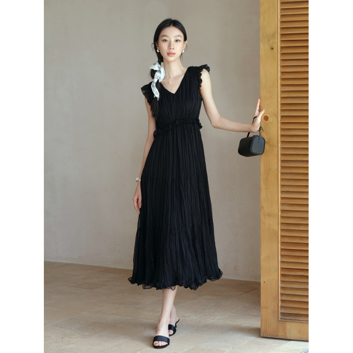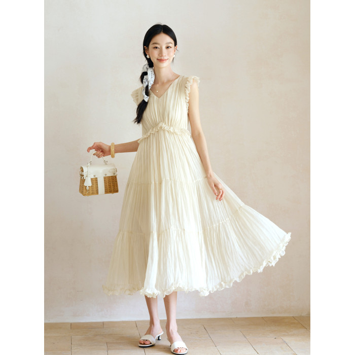超重工褶皺大裙擺+法式減齡V領顯瘦氣質女神連衣裙