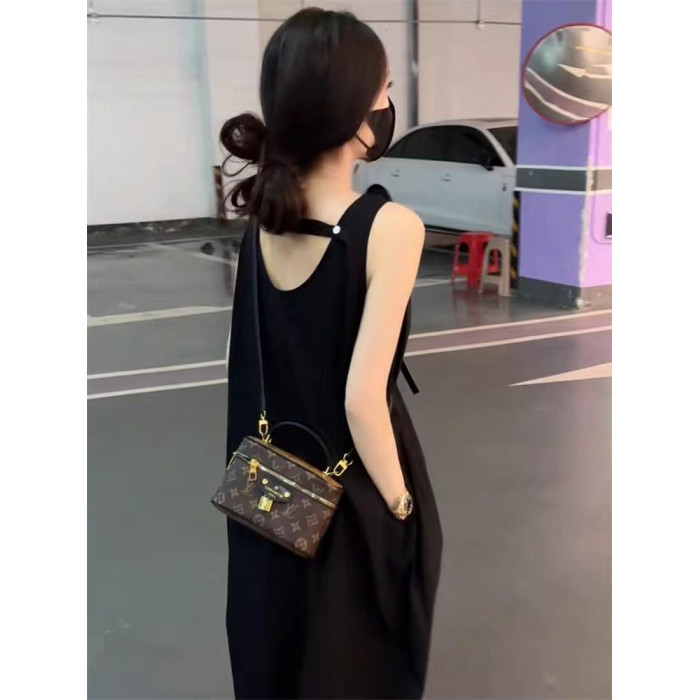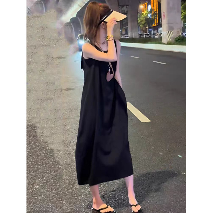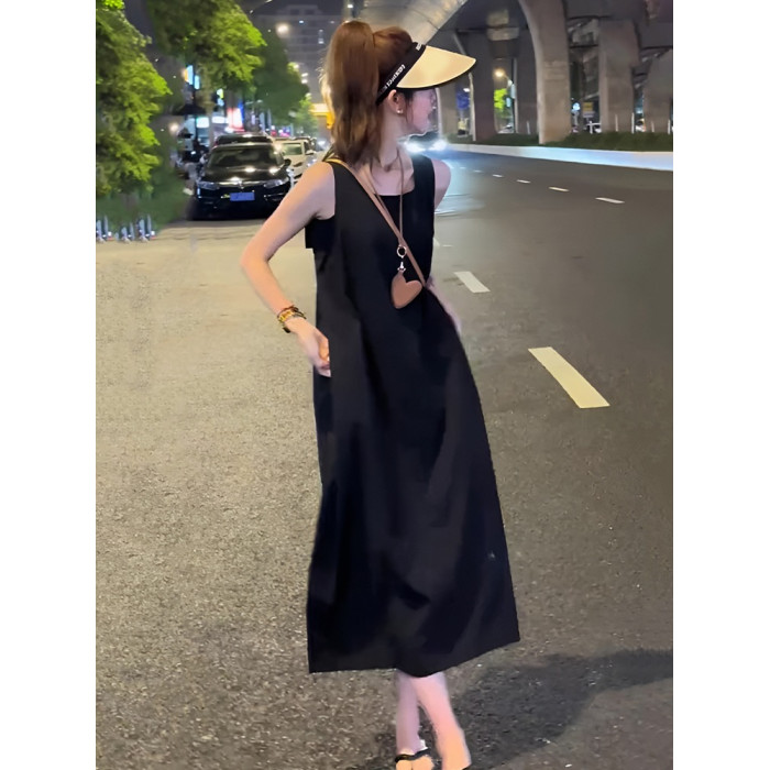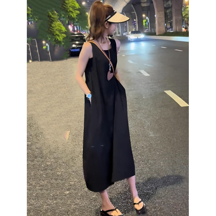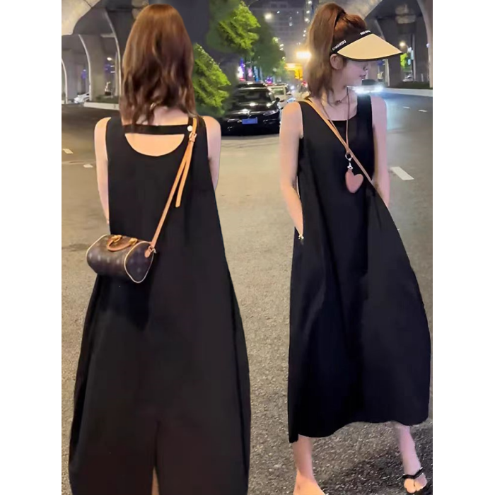 法式設計感黑色露背氣質無袖背心連衣裙赫本風後開叉寬松遮肚長裙