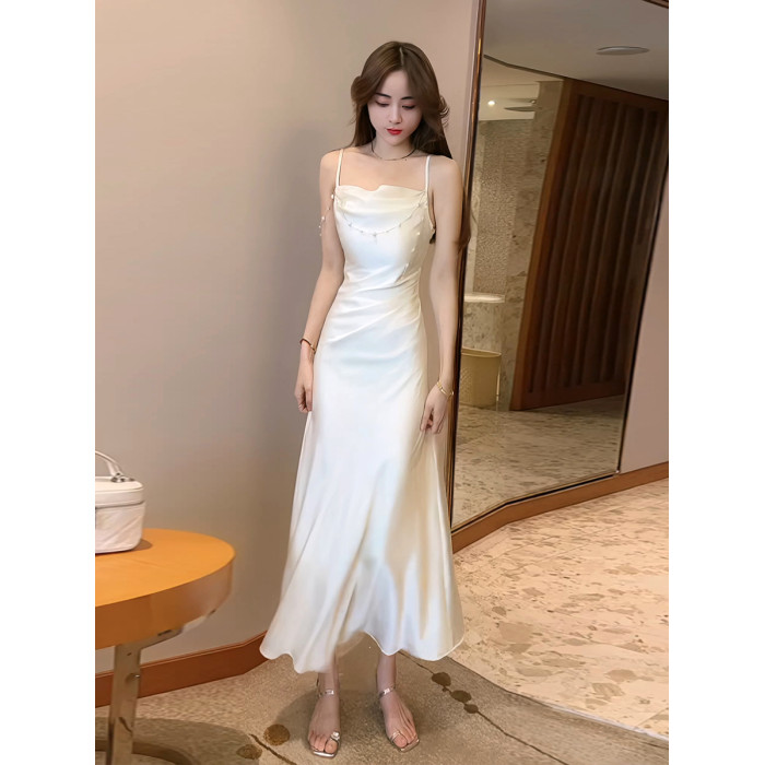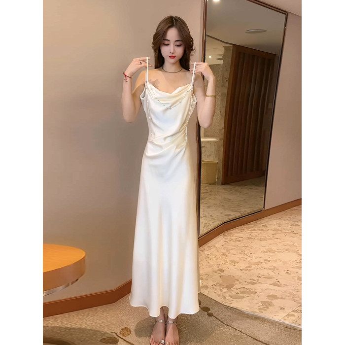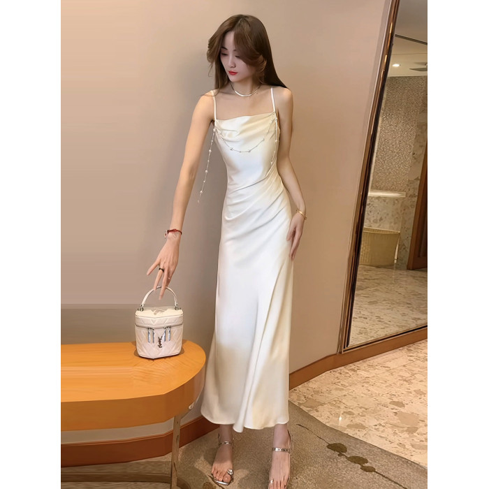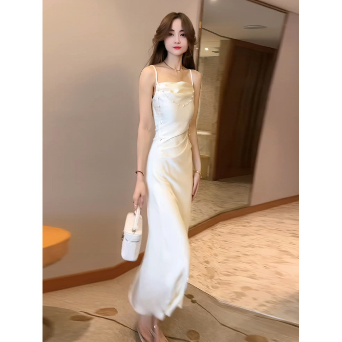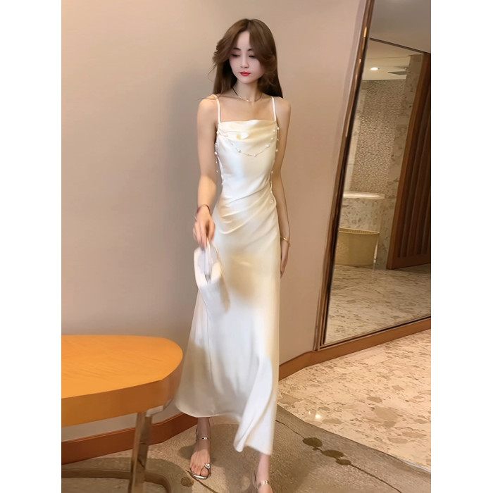 緞面花朵蕩領吊帶連衣裙女夏季設計感法式魚尾裙顯瘦收腰中長裙子