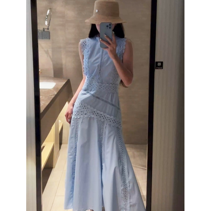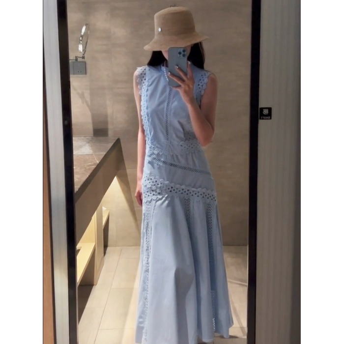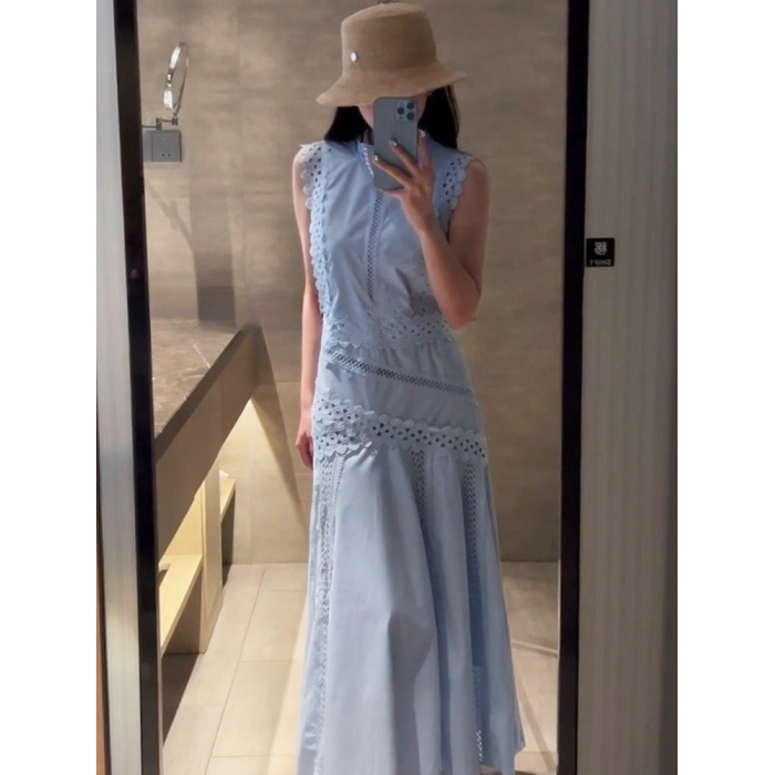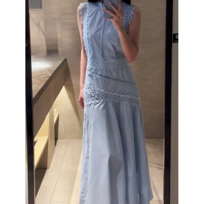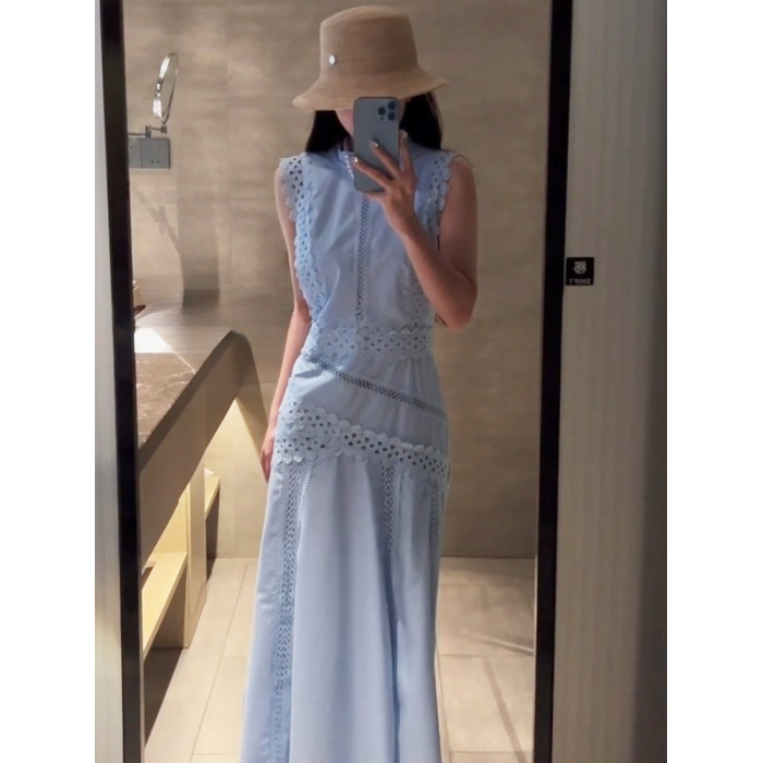 2025夏季新款法式高級感大方得體獨特漂亮度假氣質藍色無袖連衣裙