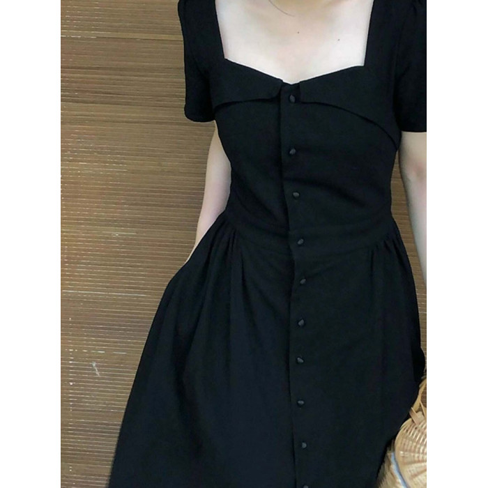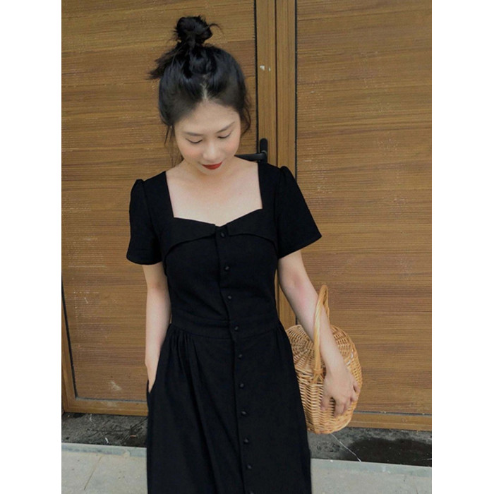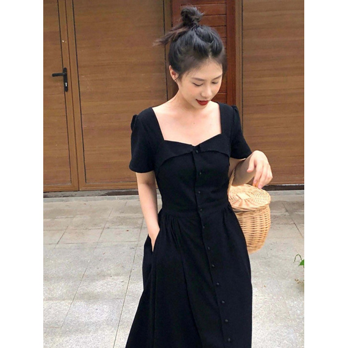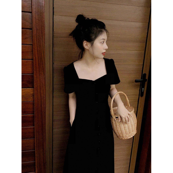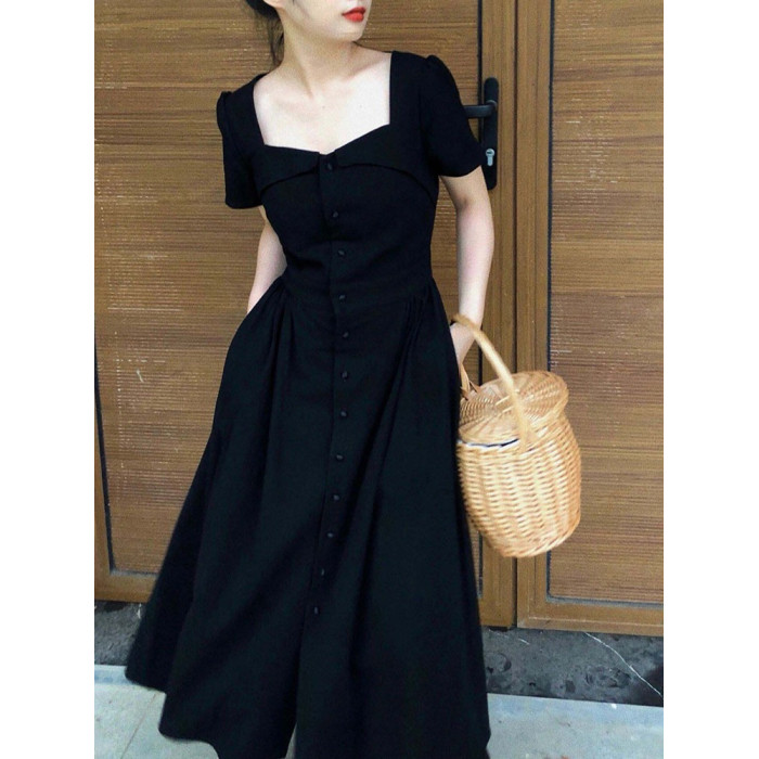 歐洲站2025新款茶歇法式長裙子修身顯瘦赫本風黑色方領連衣裙女夏
