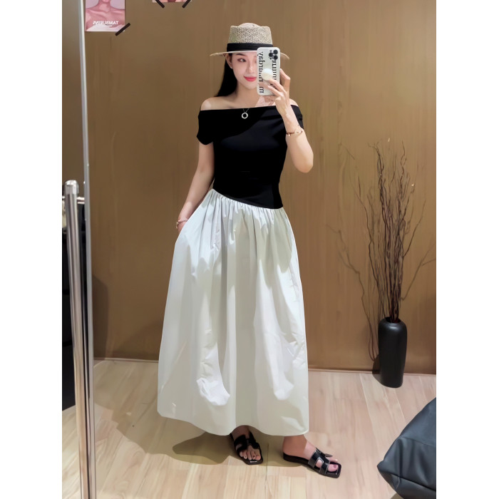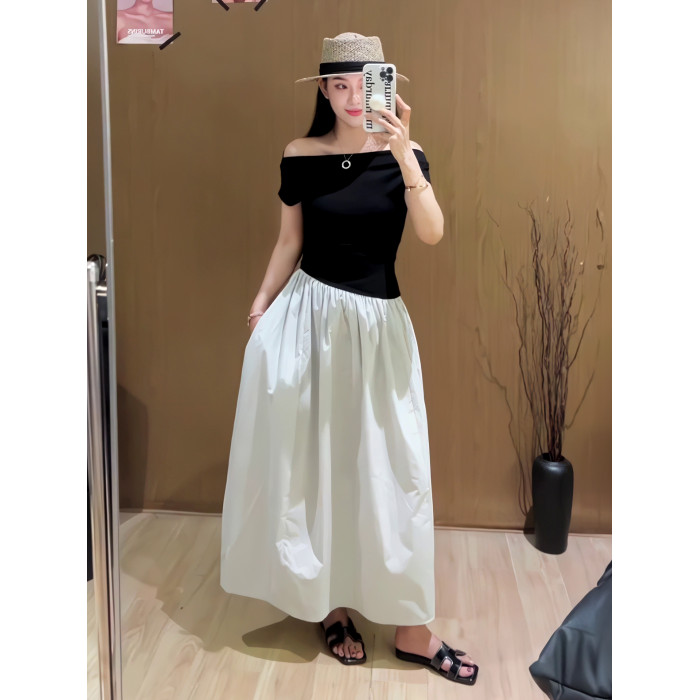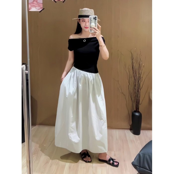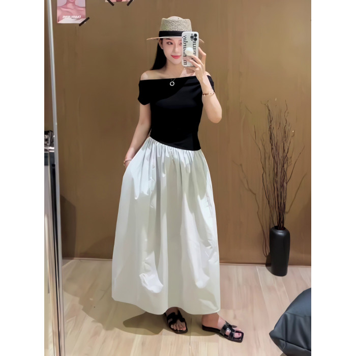 韓系撞色掐腰假兩件斜肩連衣裙女夏季高級感收腰顯瘦氣質a字長裙