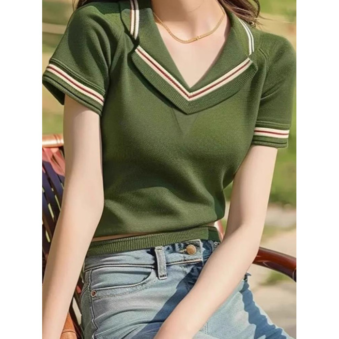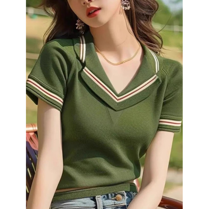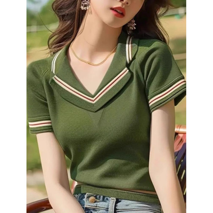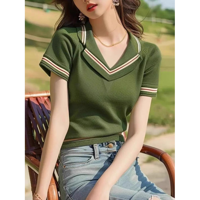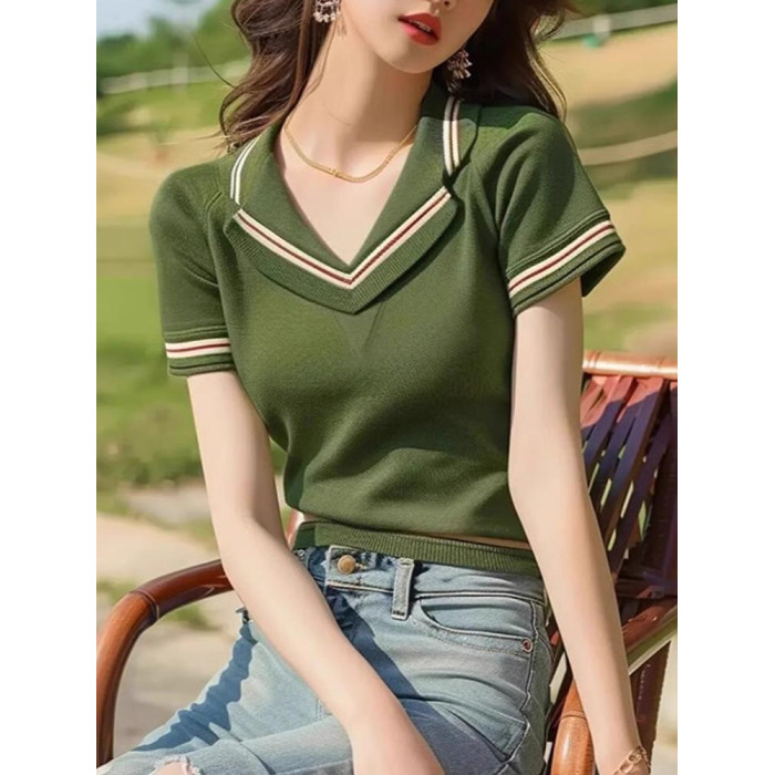 品牌折釦夏裝薄款透氣針織衫時尚氣質v領套頭打底衫修身顯瘦上衣