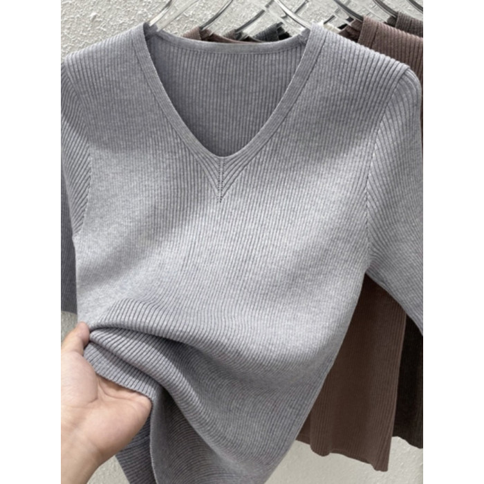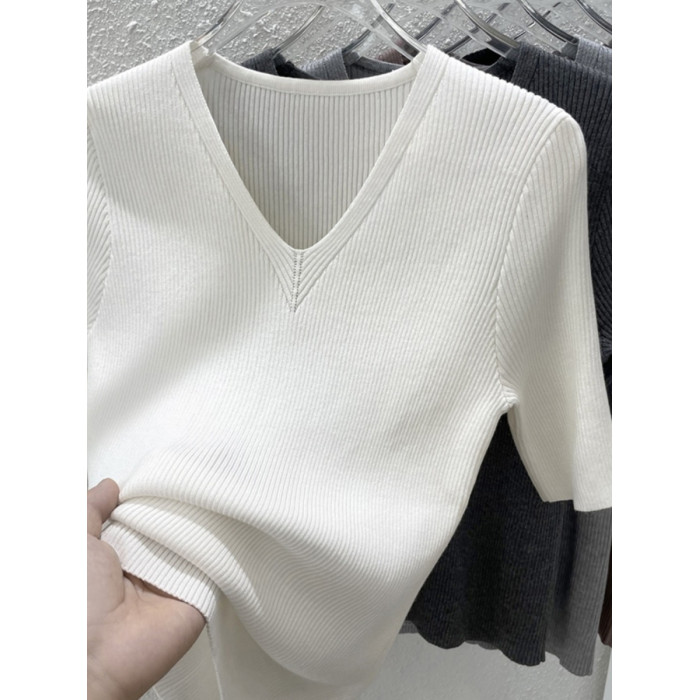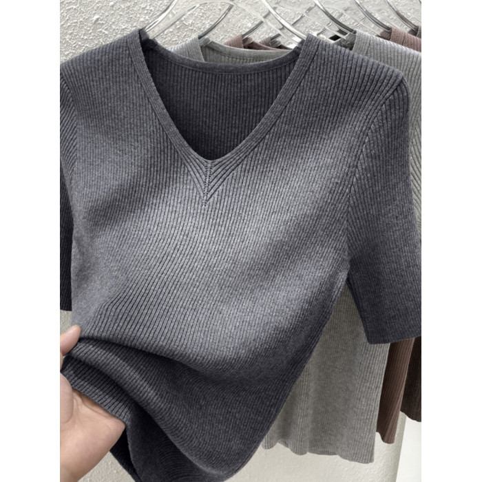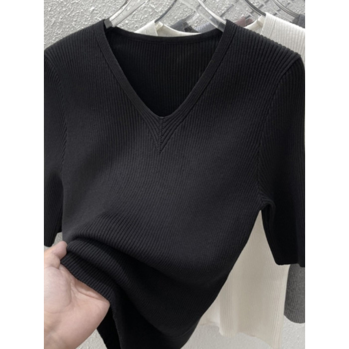 夏季2025新款v領修身內搭針織打底衫女正肩高級灰色五分袖上衣薄