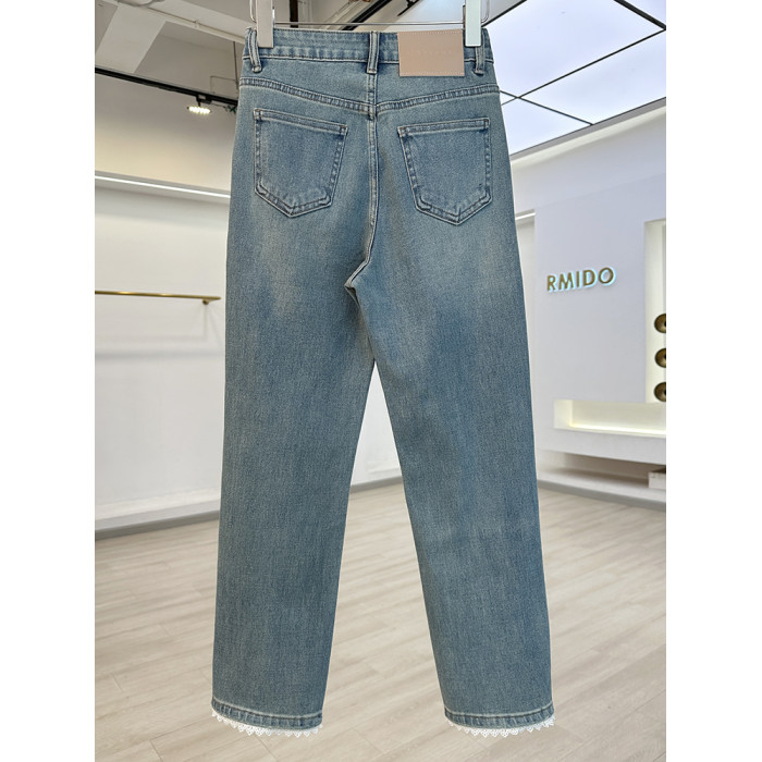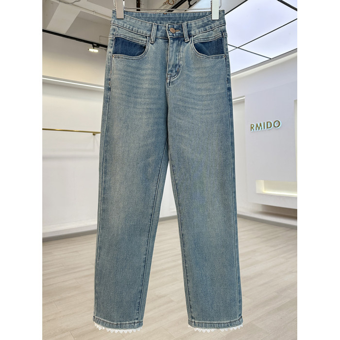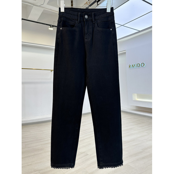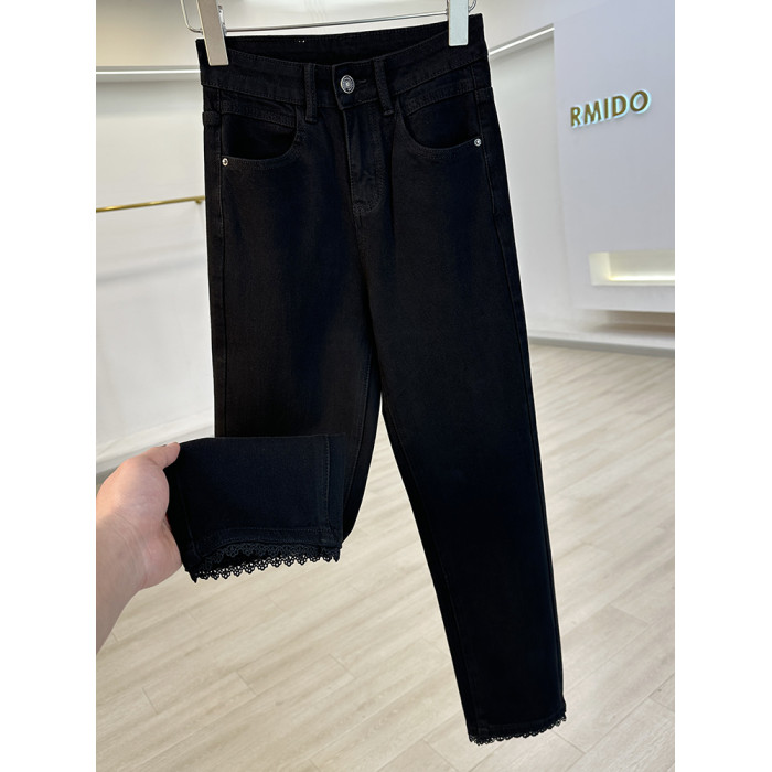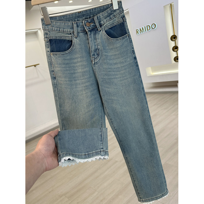 今年流行蕾絲拼接四面彈菸管褲女牛仔褲2025新款修身顯瘦九分褲子