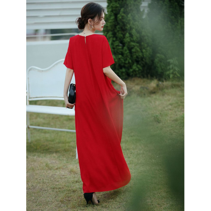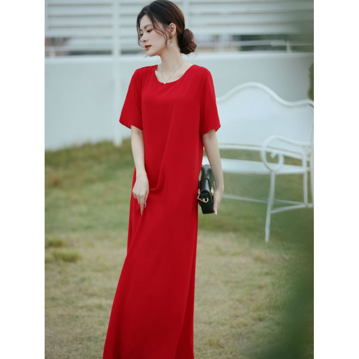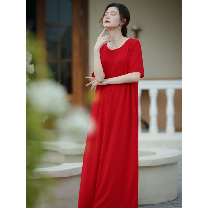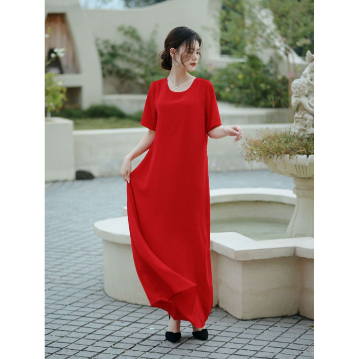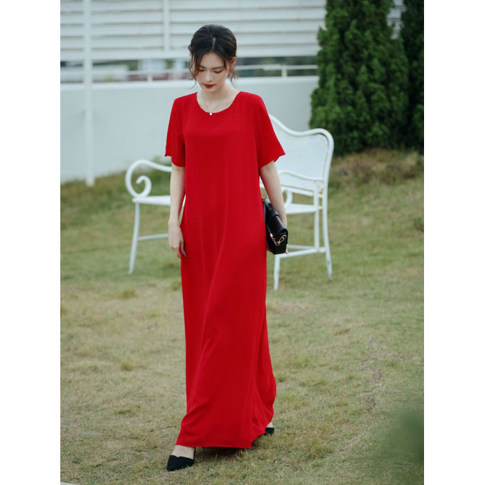 連衣裙女夏長款寬松極簡慵懶長裙短袖腳裸大碼裙氣質垂感遮肚裙