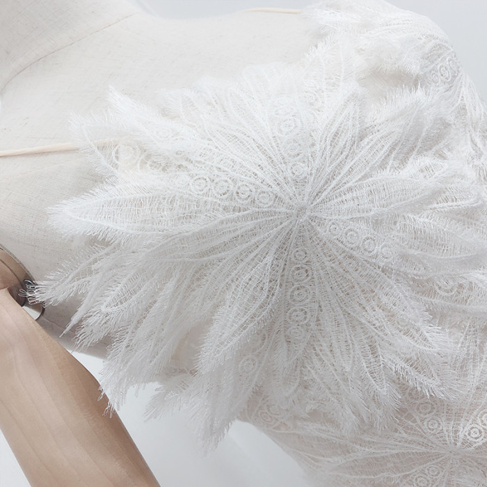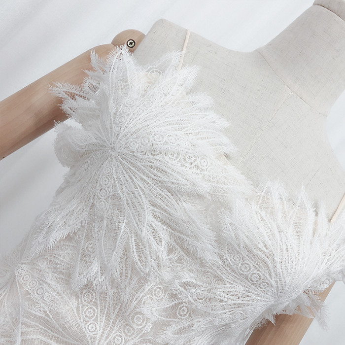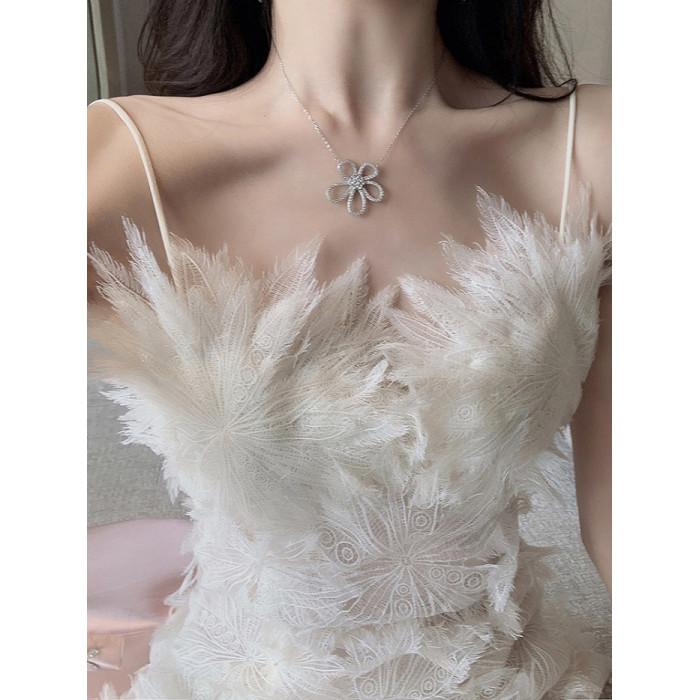 法式白色羽毛蕾絲花朵仙女裙吊帶裙鏤空性感收腰雪紡連衣裙初戀裙