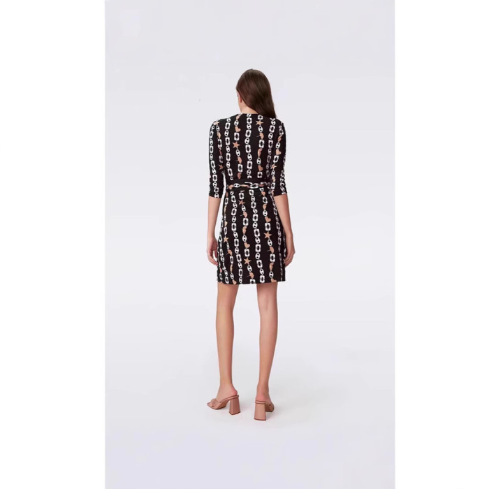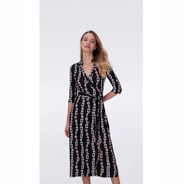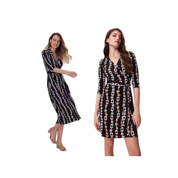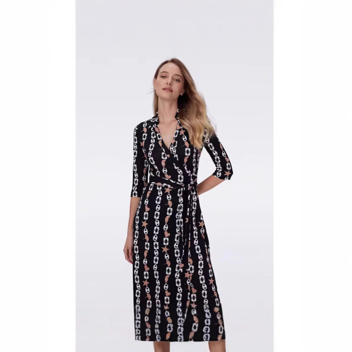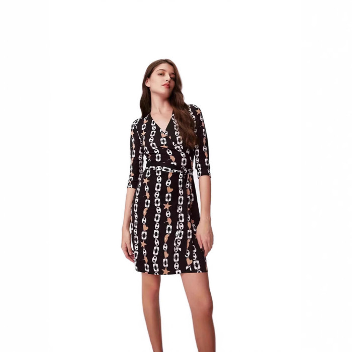 2025早春新款夢幻星片鎖鏈印花裹身裙翻領收腰綁帶凸顯身材連衣裙