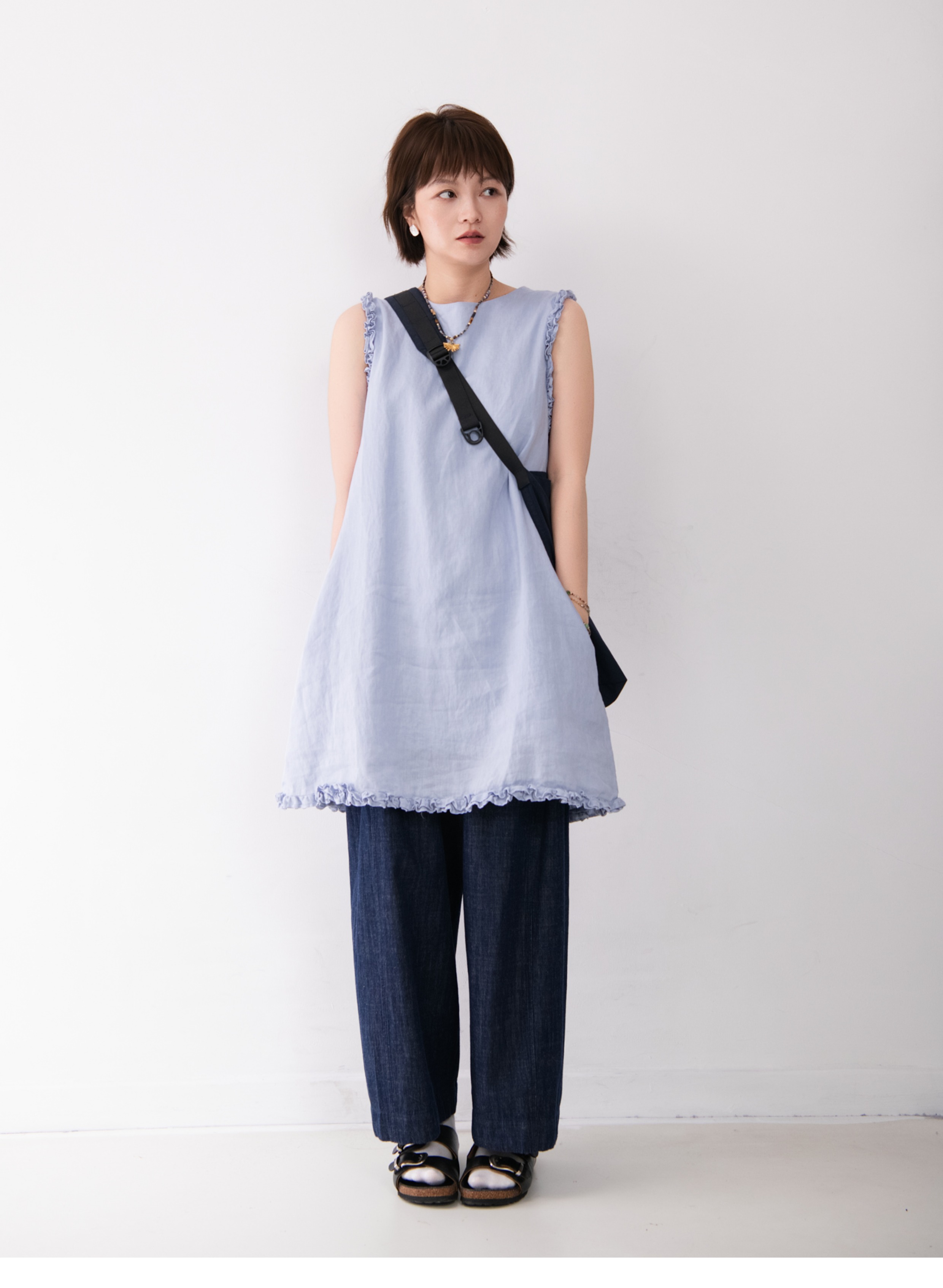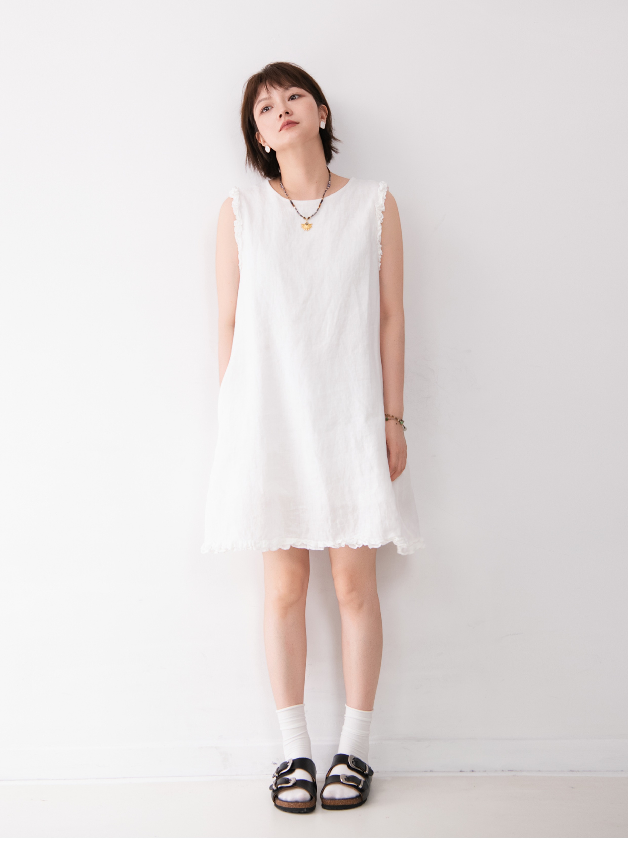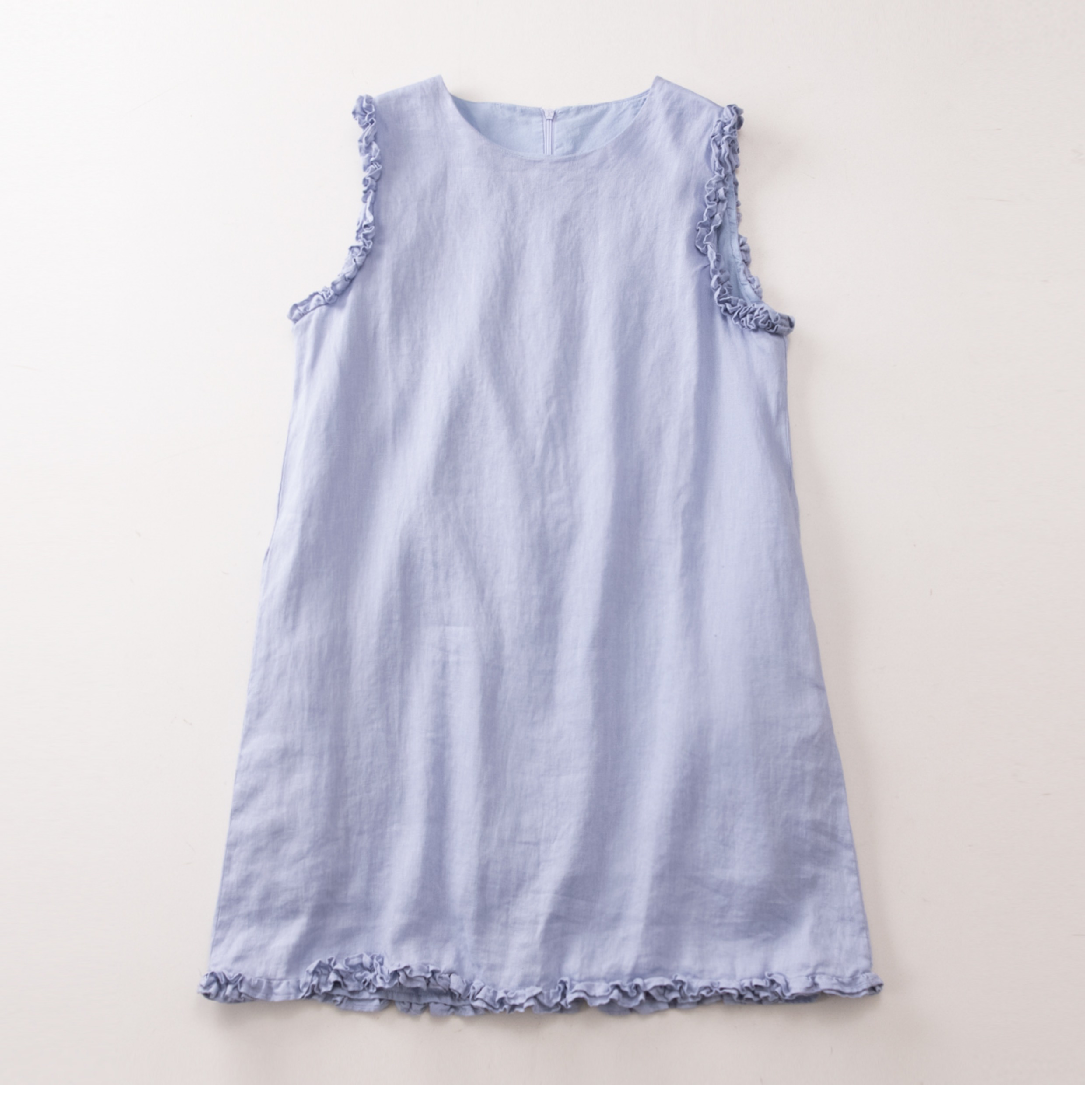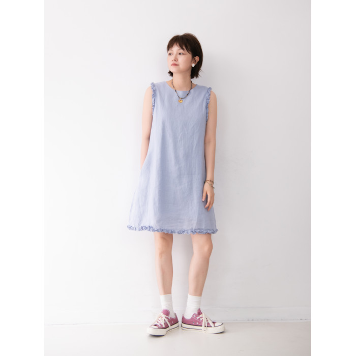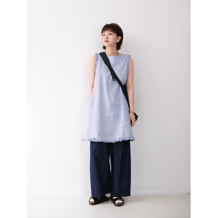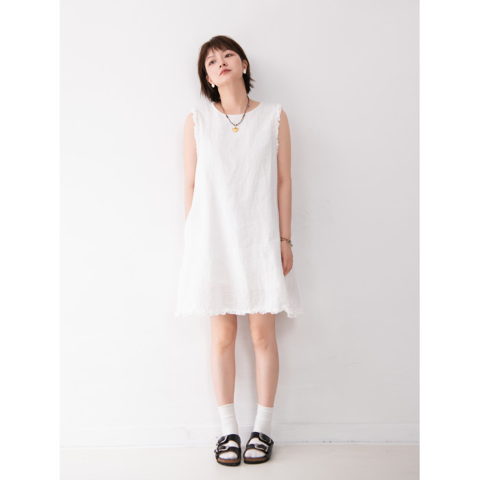 全亞麻日系木耳邊圓領A字版連衣裙女寬松百搭甜美文藝感背心裙