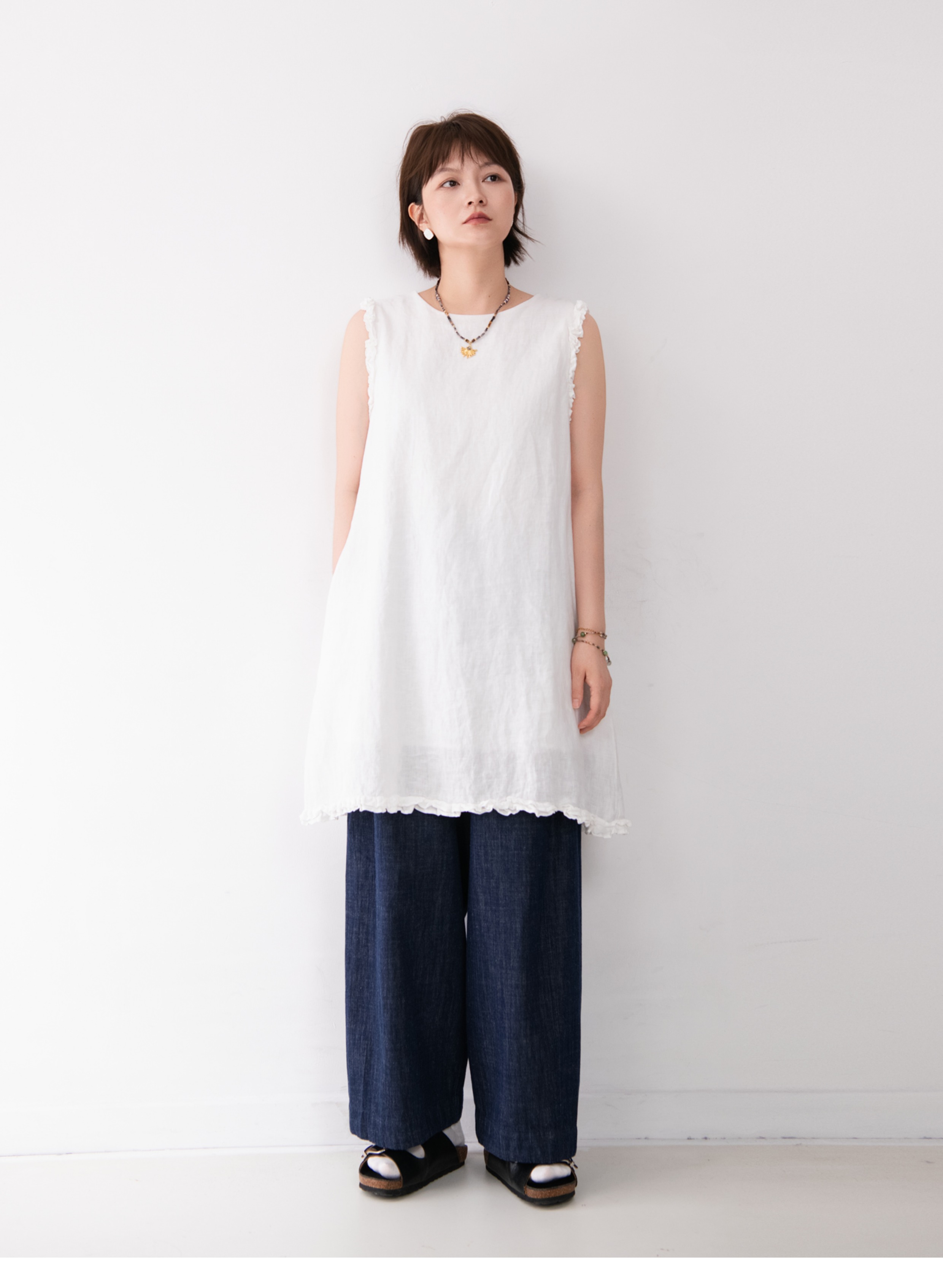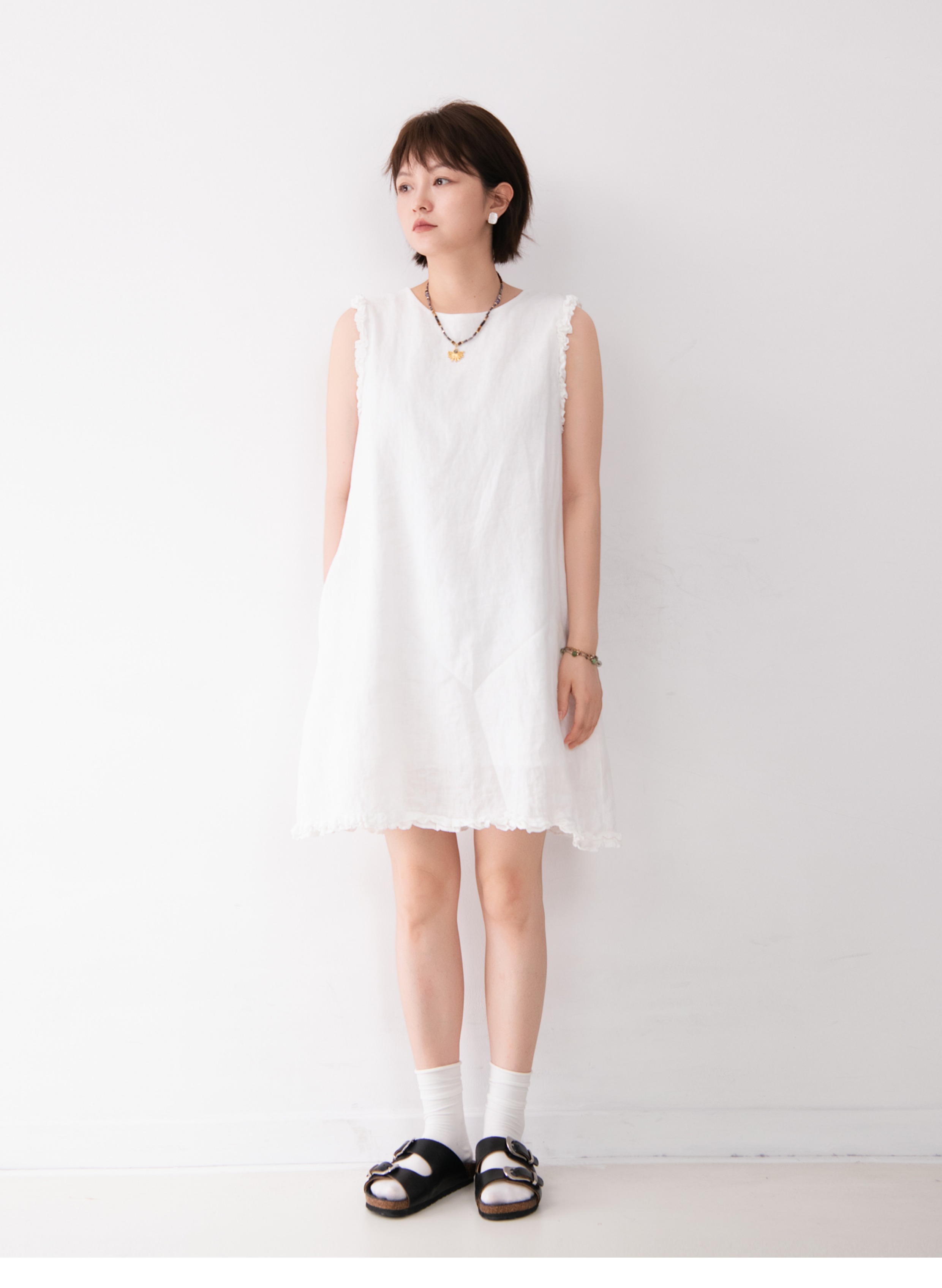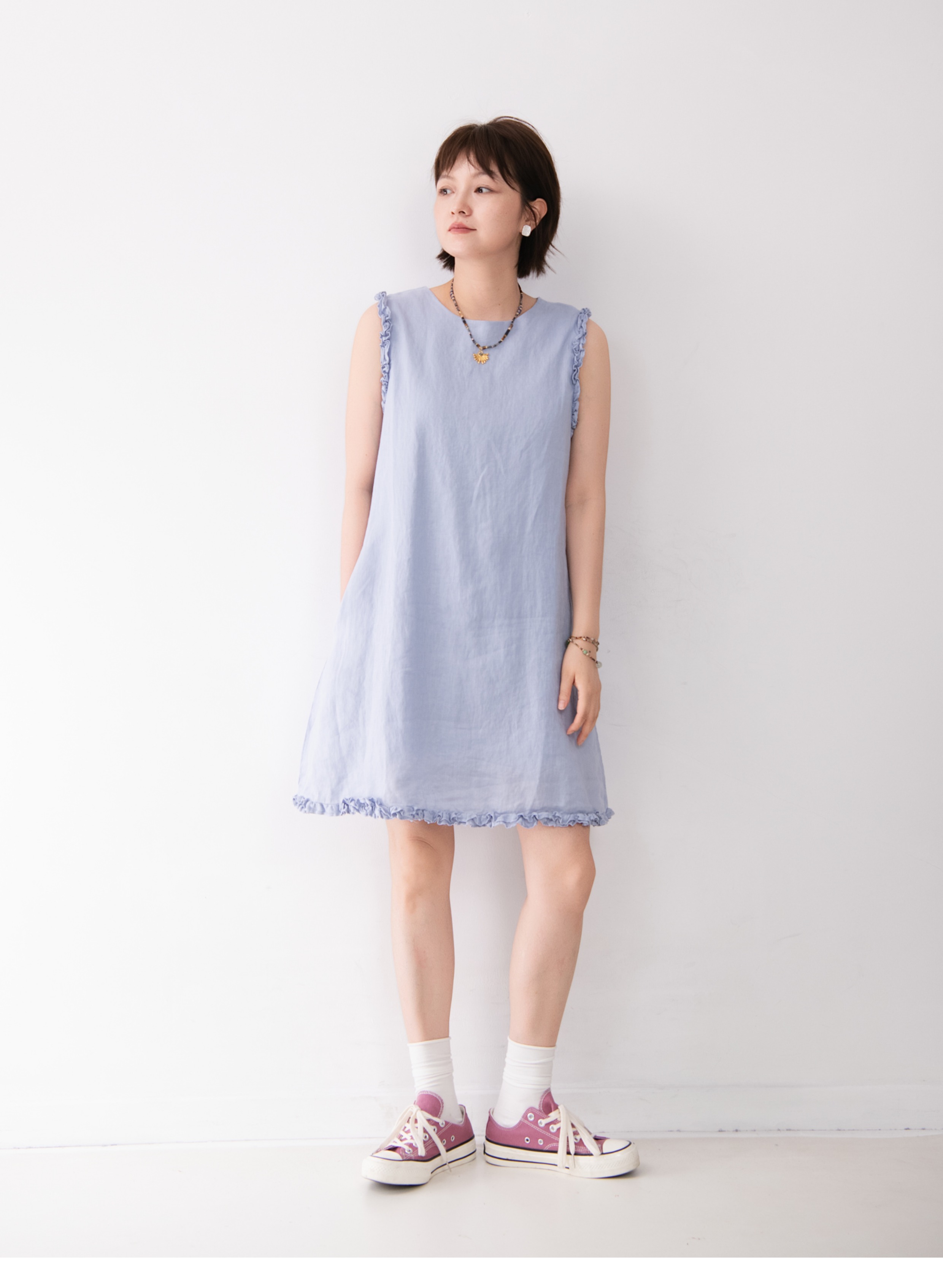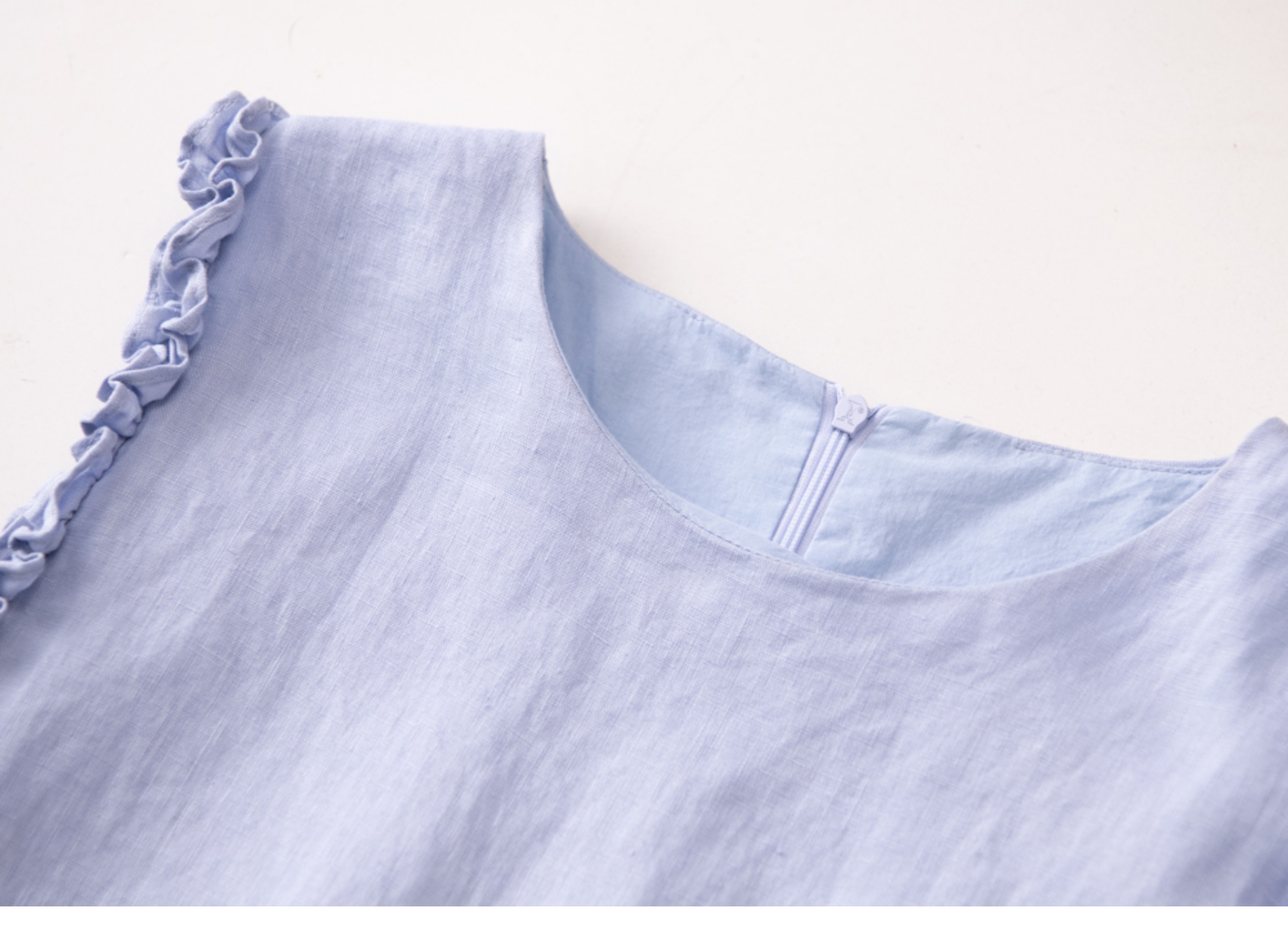 全亞麻日系木耳邊圓領A字版連衣裙女寬松百搭甜美文藝感背心裙