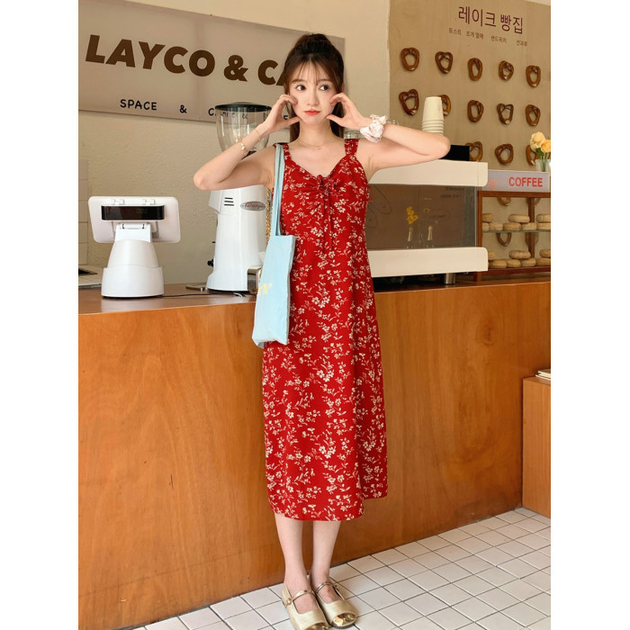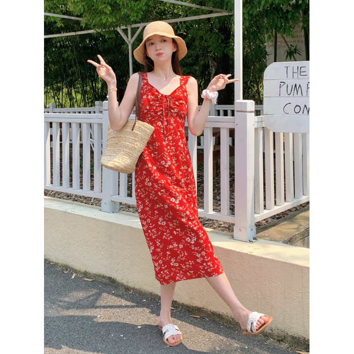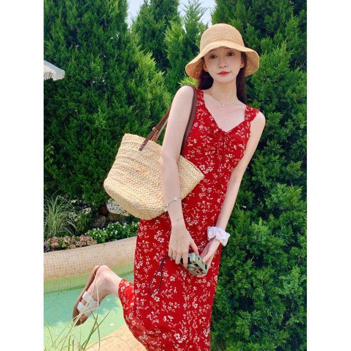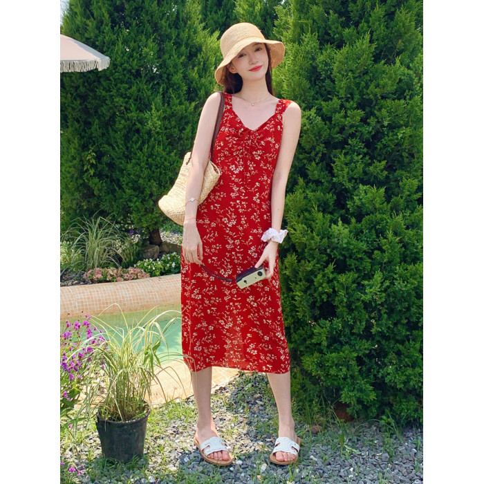 紅色碎花無袖連衣裙夏季女2025新款法式復古優雅顯瘦中長款吊帶裙
