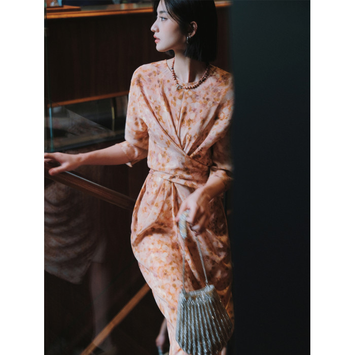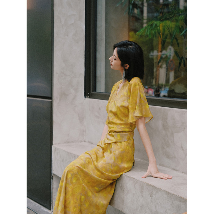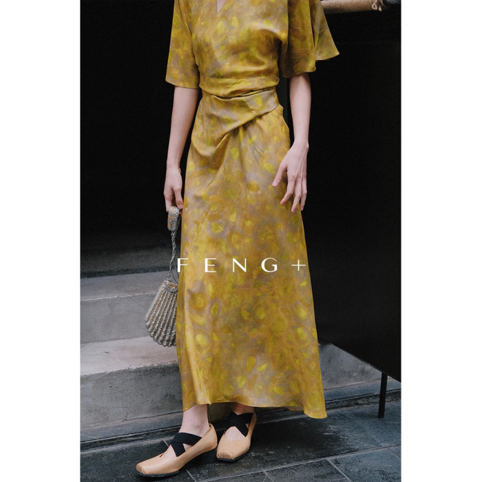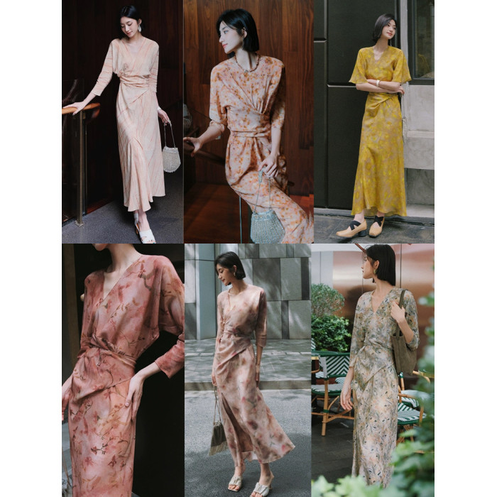 風家窄衆 桑蠶絲美裙集錦 藝術暈染真絲圍裹綁帶收腰連衣裙QZ1771
